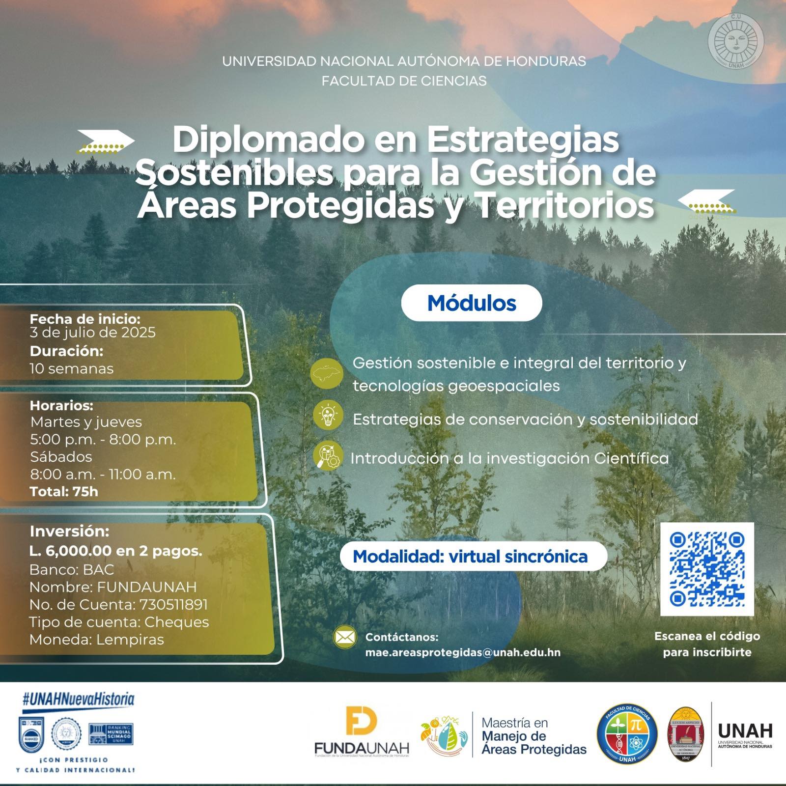 Escuela de Biología, UNAH de la Facultad de Ciencias de la UNAH te invita a participar en el Diplomado en Estrategias Sostenibles para la Gestión de Áreas Protegidas y Territorios, un programa académico diseñado para fortalecer tus capacidades en: