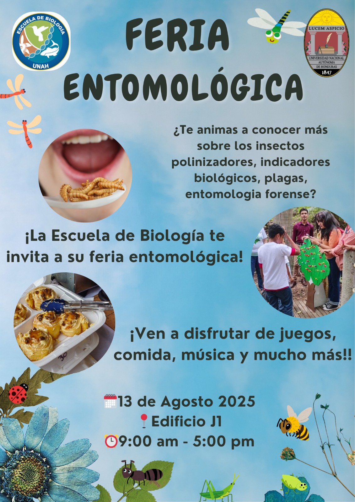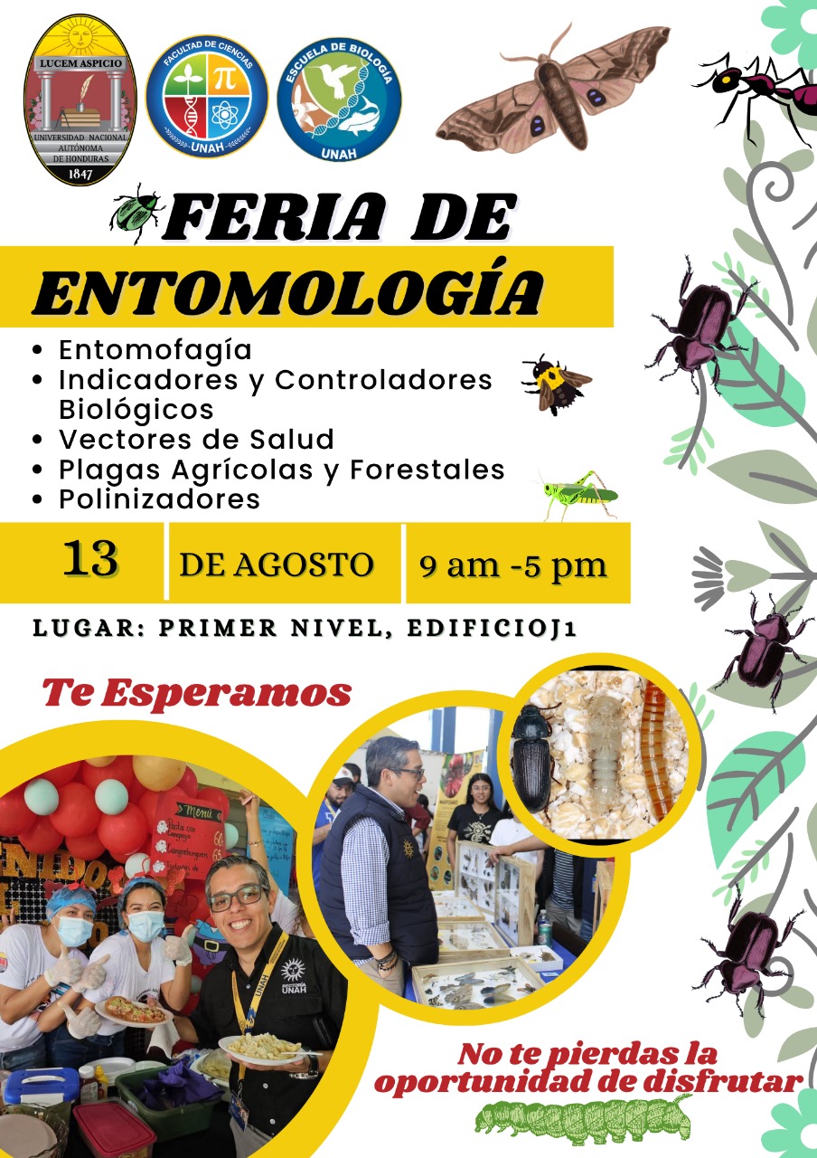 La Escuela de Biología, UNAH de la Facultad de Ciencias te invita a adentrarte en el fascinante mundo de la entomología, la ciencia que estudia a los insectos, este 13 de agosto de 2025, de 9:00 a.m. a 5:00 p.m. en el primer piso del edificio J1.