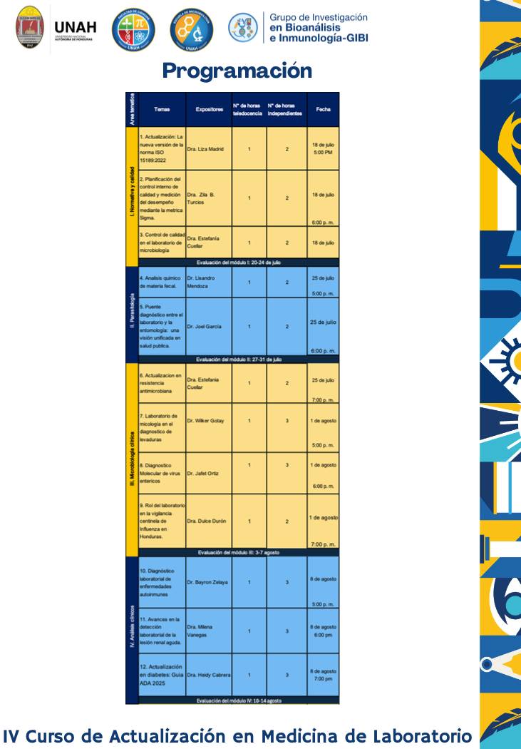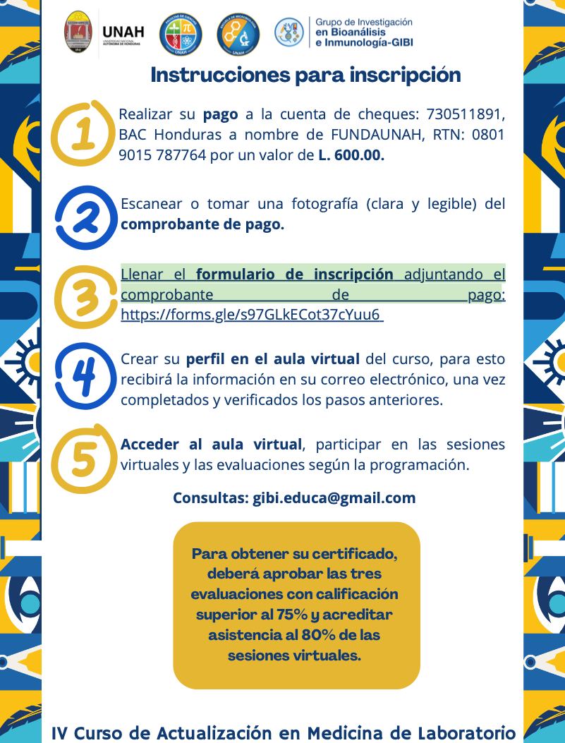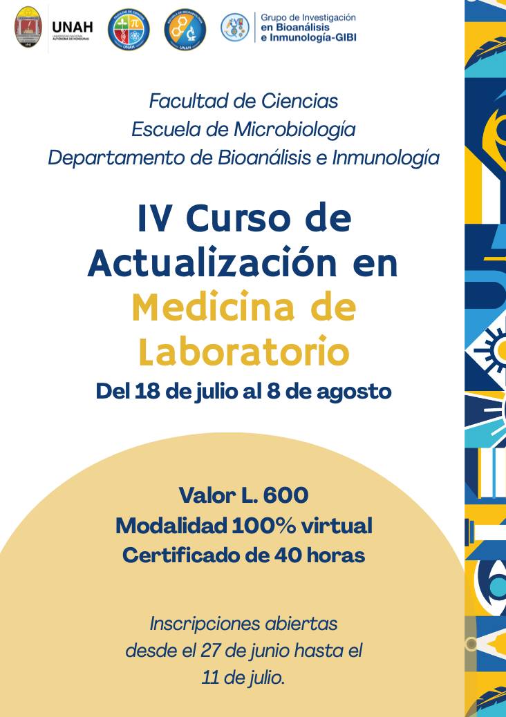 La Facultad de Ciencias, a través de la Escuela de Microbiología - UNAHy su Departamento de Bioanálisis e Inmunología, tiene el agrado de invitarte al IV Curso de Actualización en Medicina de Laboratorio.