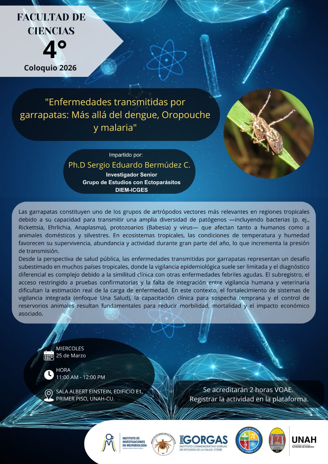 Una conferencia que abordará la importancia de las garrapatas como vectores de diversas enfermedades en regiones tropicales, destacando los retos en salud pública, diagnóstico y vigilancia epidemiológica desde un enfoque integral de Una Salud.