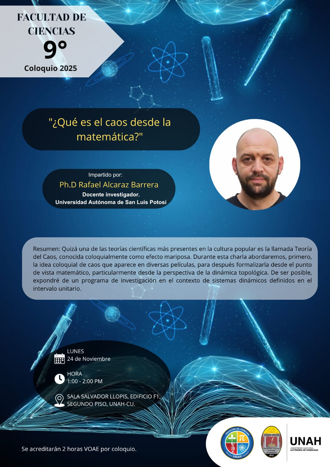 La Teoría del Caos —famosa por el llamado efecto mariposa— ha inspirado múltiples obras de la cultura popular. En este coloquio exploraremos primero esa visión cotidiana del caos que vemos en películas y medios, para luego comprender su verdadero significado desde el enfoque matemático, especialmente desde la dinámica topológica. Si el tiempo lo permite, también se presentará un programa de investigación sobre sistemas dinámicos en el intervalo unitario.