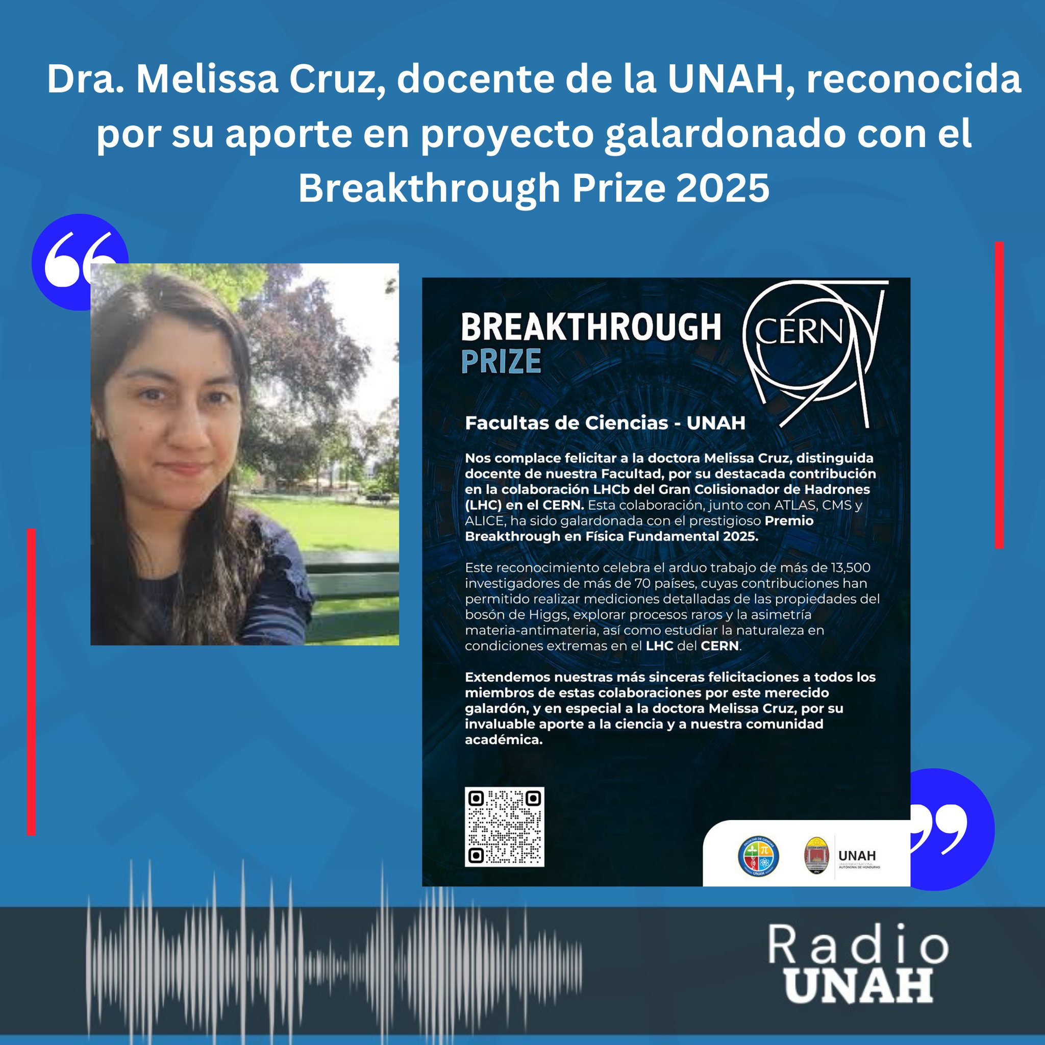 Felicitamos a la Dra. Cruz por enaltecer el nombre de la UNAH y de Honduras en la ciencia internacional.