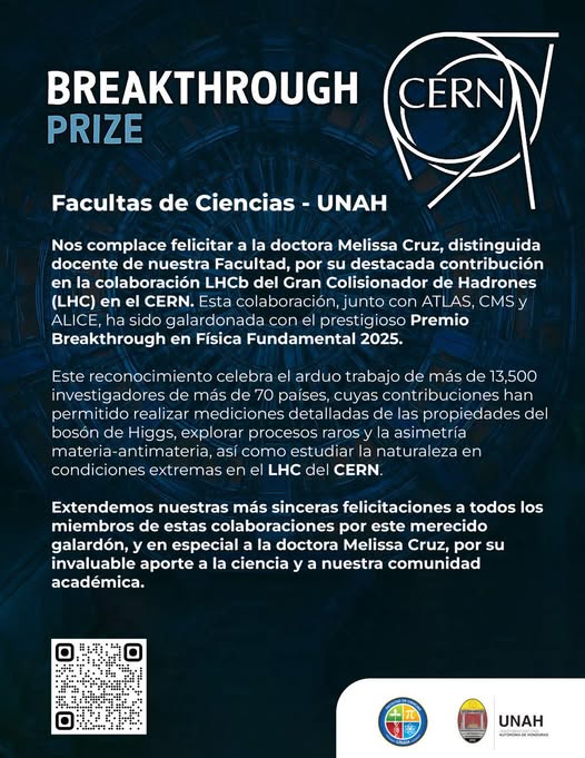 Nos complace felicitar a la Dra. Melissa Cruz, distinguida docente de la Escuela de Física UNAH CU por su destacada contribución en la colaboración LHCb del Gran Colisionador de Hadrones (LHC) en el CERN