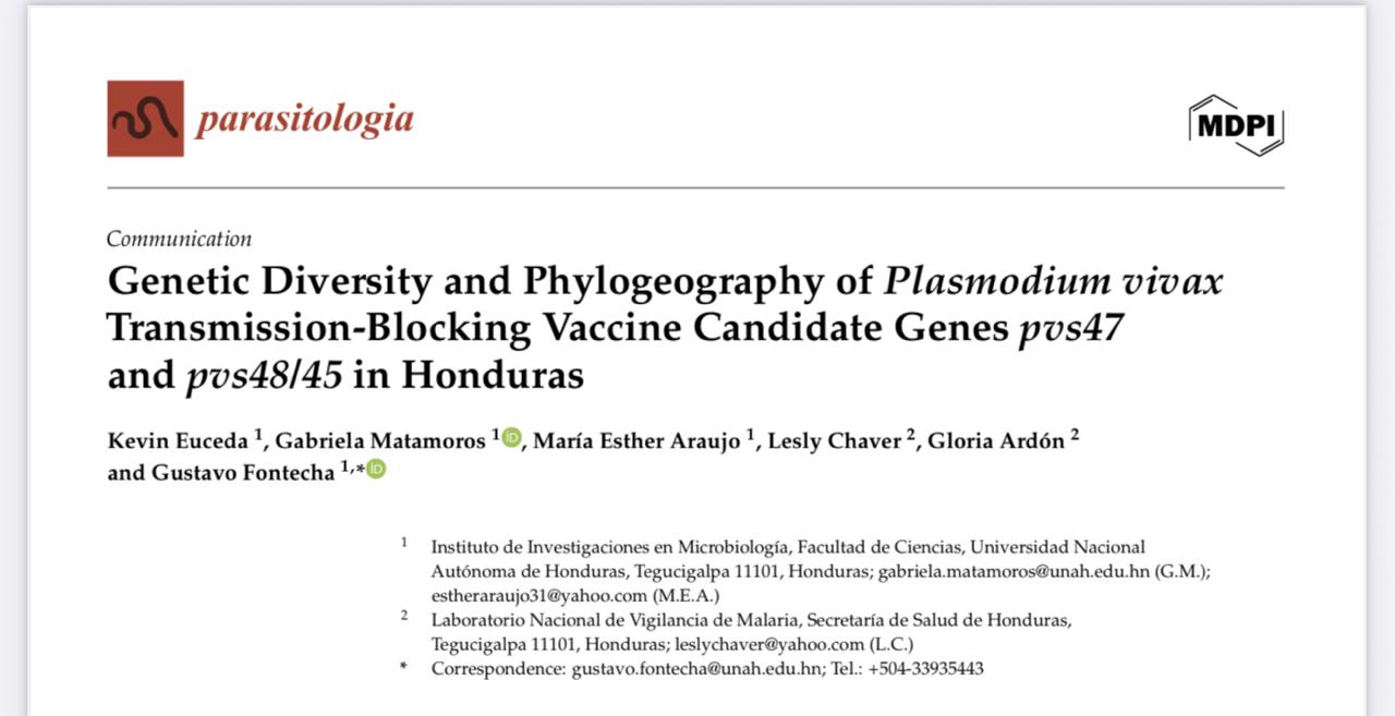 Este estudio, realizado en colaboración con la Secretaría de Salud Honduras, analiza la diversidad genética de los genes pvs47 y pvs48/45 de Plasmodium vivax , candidatos a vacunas bloqueadoras de transmisión.
