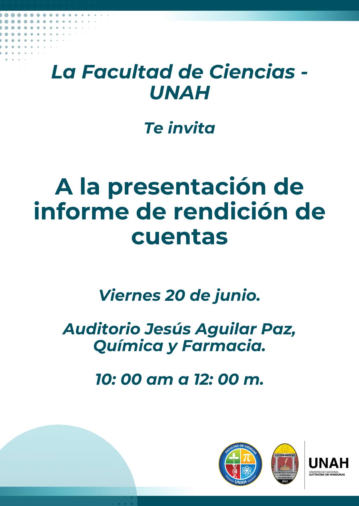 La Facultad de Ciencias de la UNAH extiende una cordial invitación a toda su comunidad universitaria: estudiantes, personal docente, administrativo, de servicio y al público en general, a la presentación del Informe de Rendición de Cuentas correspondiente al período 2024.