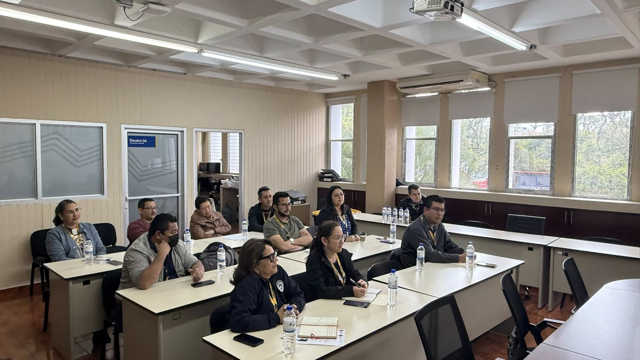 La reunión es presidida por el señor decano Bryan Larios, con la presencia de directores de escuela y coordinadores de carrera, reafirmando el compromiso institucional con el fortalecimiento de la gestión académica y administrativa.