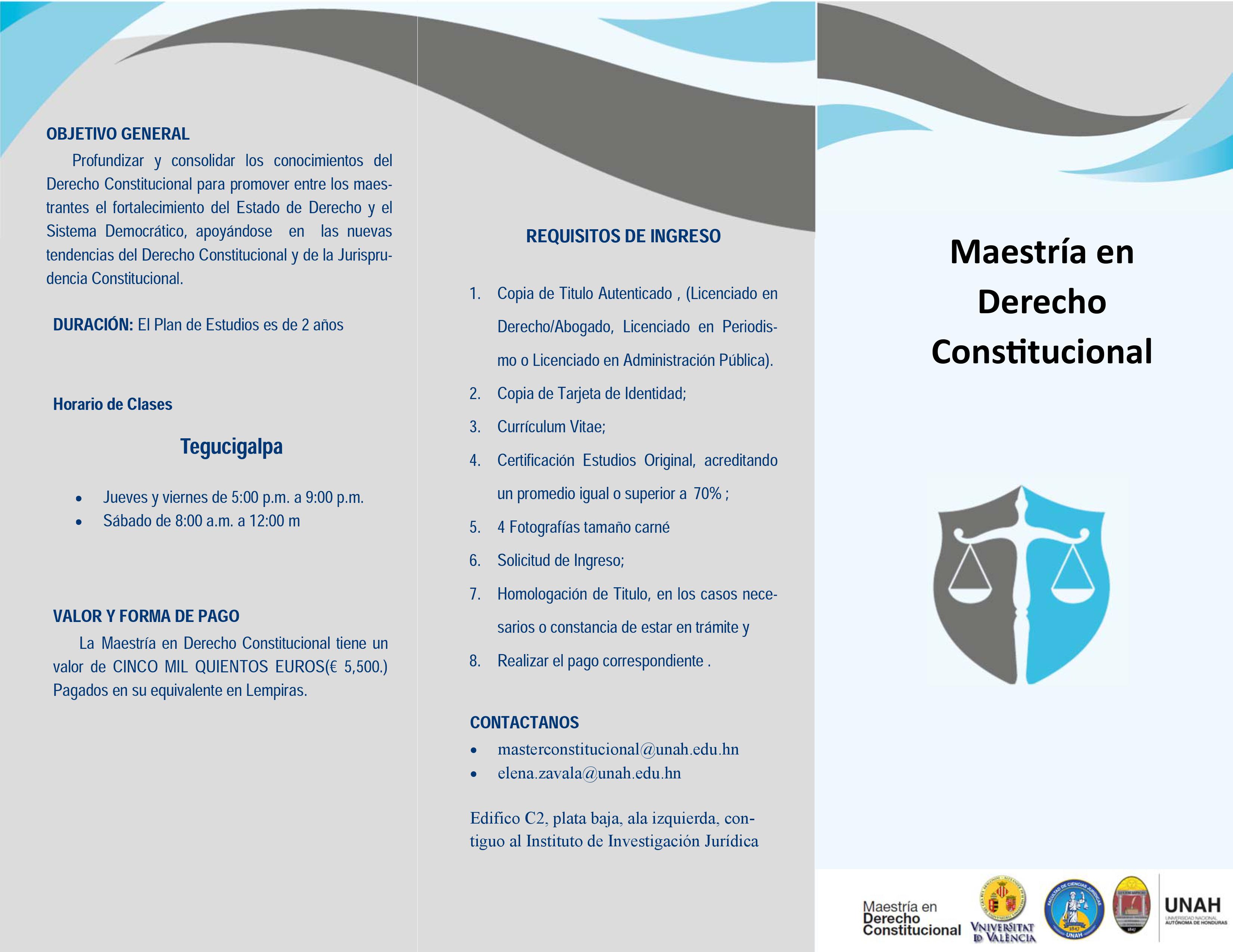 La Maestría en Derecho Constitucional tiene un valor de CINCO MIL QUIENTOS EUROS(€ 5,500.) Pagados en su equivalente en Lempiras.
