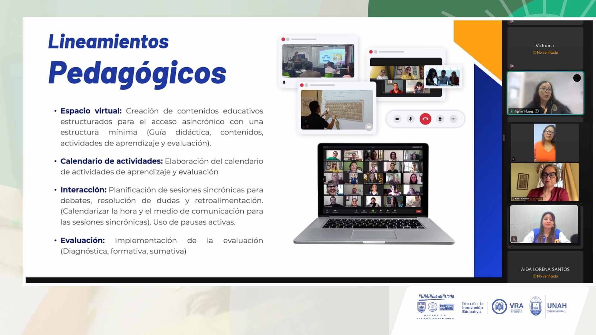 Durante la capacitación, los participantes recibieron lineamientos pedagógicos y técnicos propios de la modalidad de Teledocencia, abordando aspectos clave como las sesiones sincrónicas, el uso del Campus Virtual UNAH, la asistencia y participación estudiantil, así como las estrategias de evaluación adaptadas a este entorno académico.