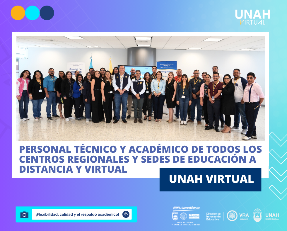 La Vicerrectoría Académica a través de su Dirección de Innovación Educativa y el Sistema de Educación a Distancia culminó exitosamente la jornada de trabajo para la gestión académica y tecnológica de UNAH Virtual, realizada los días 24 y 25 de julio de 2025, donde participó personal técnico y académico de todos los centros regionales y sedes de educación a distancia de la UNAH.
