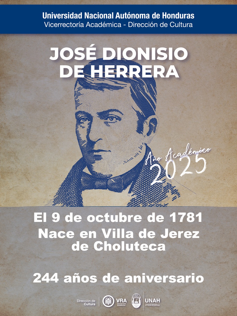 La UNAH se llena de orgullo al conmemorar una de las fechas mas significativas asociadas al Año Académico 2025: “José Dionisio de Herrera”; coincidente con su nacimiento en la Villa de Jerez de Choluteca el 9 de octubre de 1781, hace 244 años.