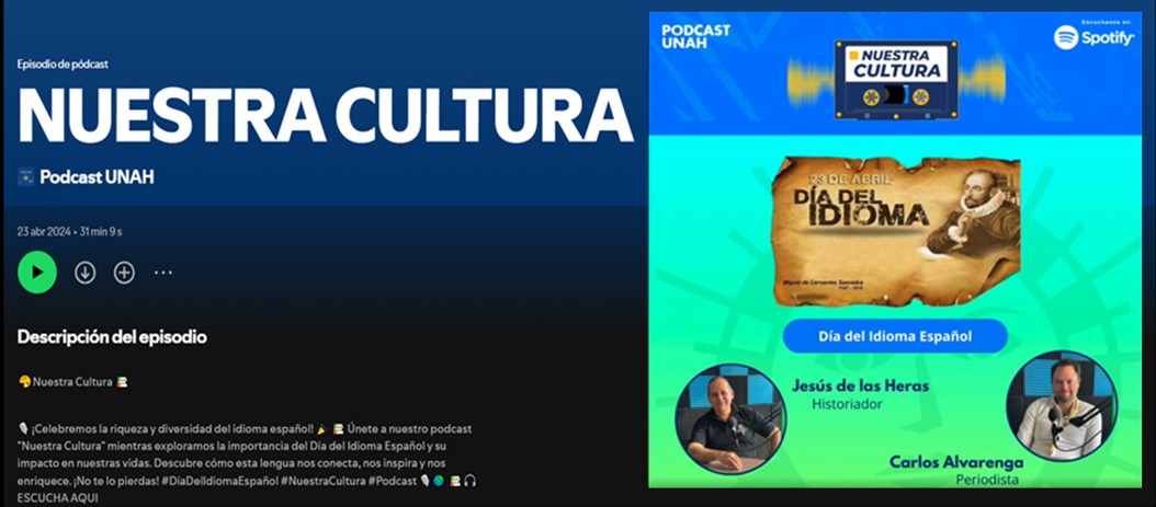 La Dirección de Cultura a través de la Coordinación en Conservación de Colecciones Patrimoniales, ha generado en el marco del día del idioma un episodio del Podcast Nuestra Cultura, dedicado al tema: “Cervantes y el día del Libro”. Este y otros episodios del podcast son generados junto a Radio UNAH con el fin de contribuir a la divulgación de temas históricos, artísticos y patrimoniales de nuestra nación y del mundo.