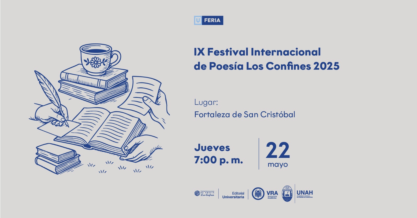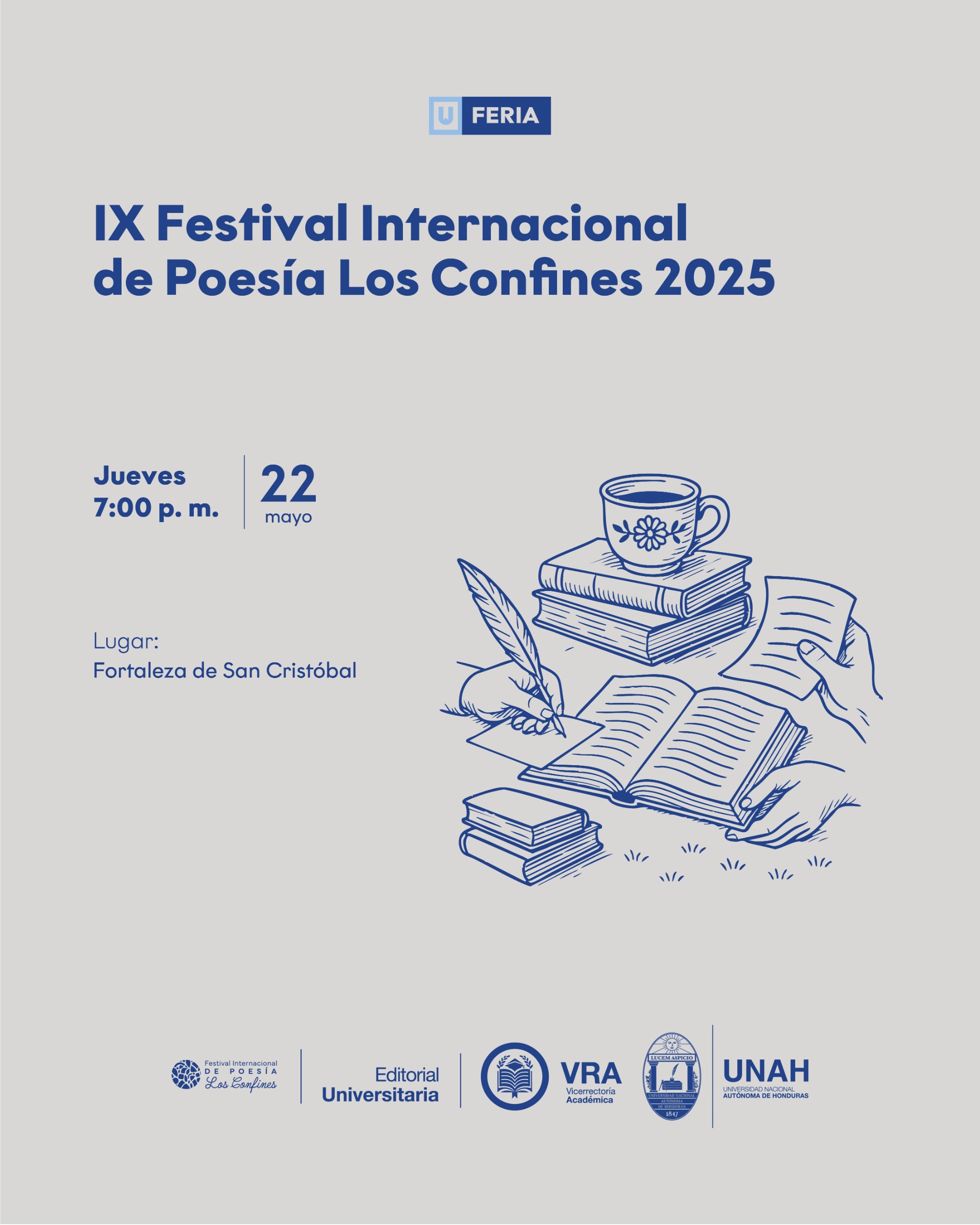 Tegucigalpa, 21 de mayo de 2025. Como parte de nuestra segunda participación en ferias literarias durante el Año Académico 2025 José Dionisio de Herrera, la Vicerrectoría Académica, a través de la Editorial Universitaria, formará parte del IX Festival Internacional de Poesía Los Confines, que se celebrará del 21 al 25 de mayo en Gracias, Lempira, y Copán Ruinas.