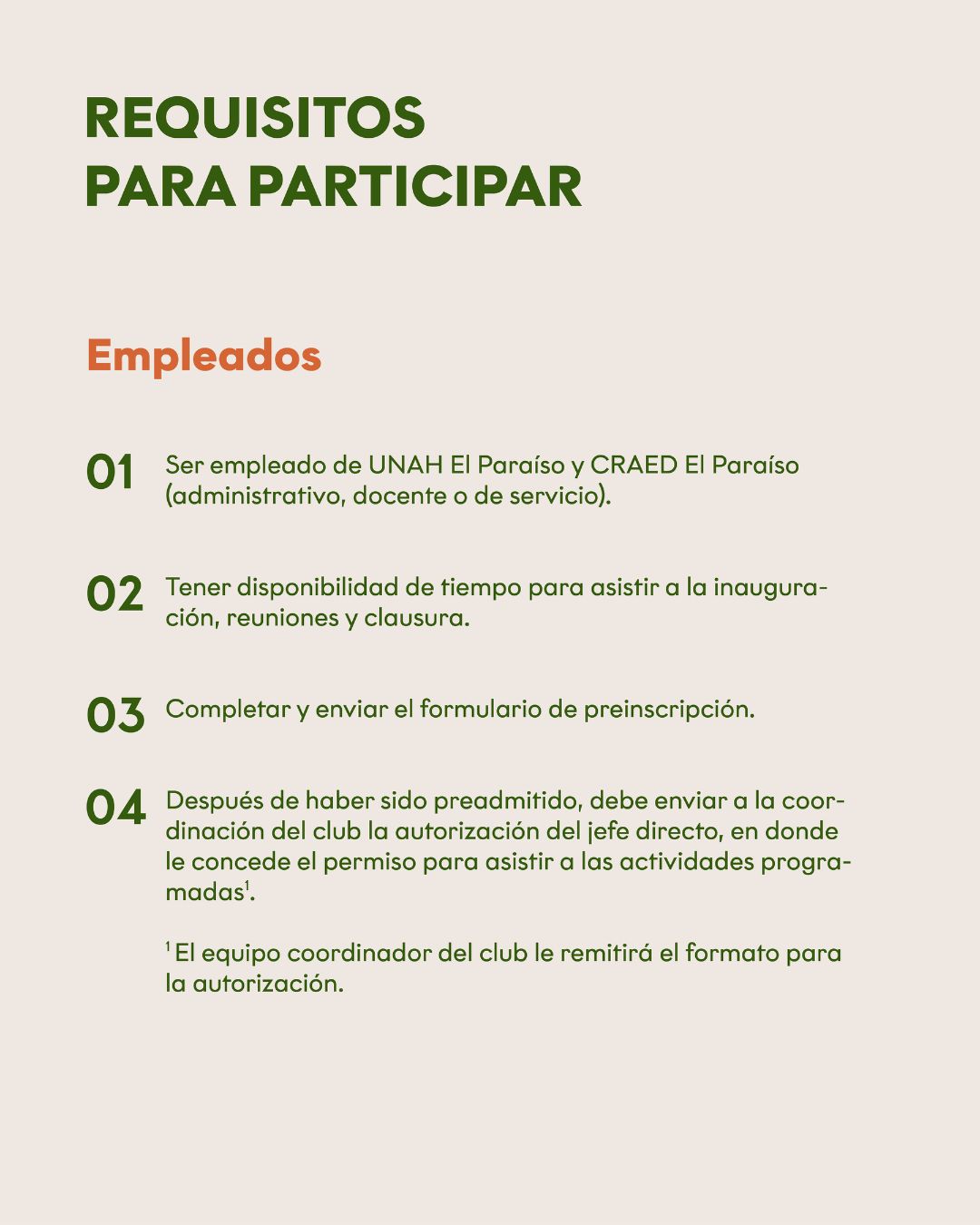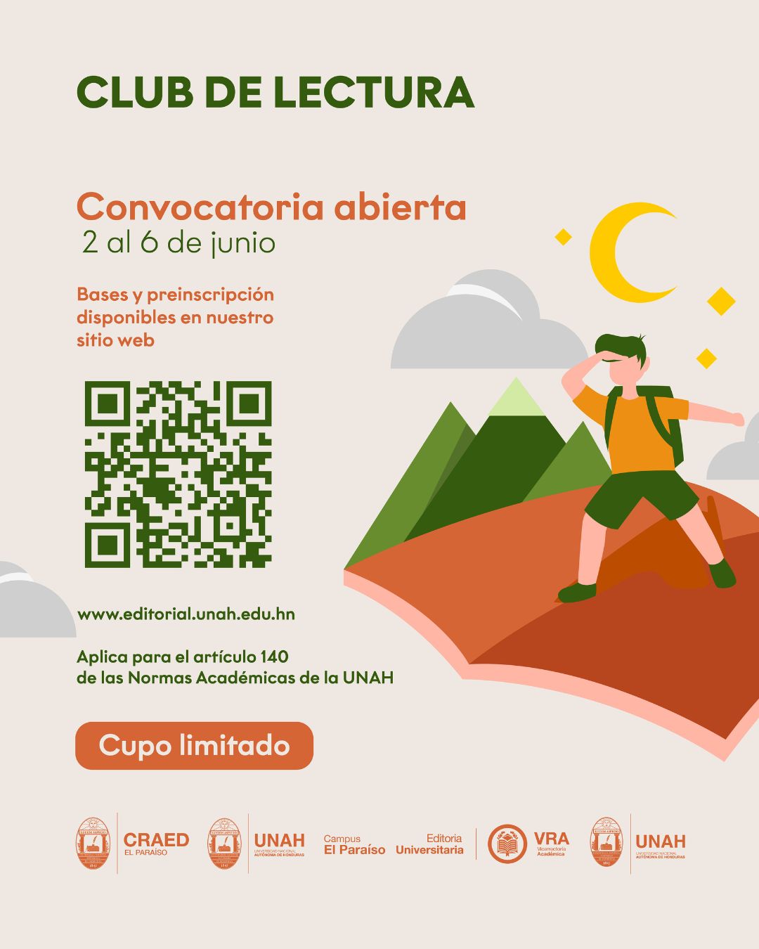 Las preinscripciones estarán abiertas del 2 al 6 de junio. Al ser parte de esta oportunidad en la que vas a mejorar el hábito lector y tus conocimientos, se concederán 15 horas académicas y 15 horas culturales del Artículo 140. Podés preinscribirte a través del siguiente link Club de Lectura UNAH El Paraíso.