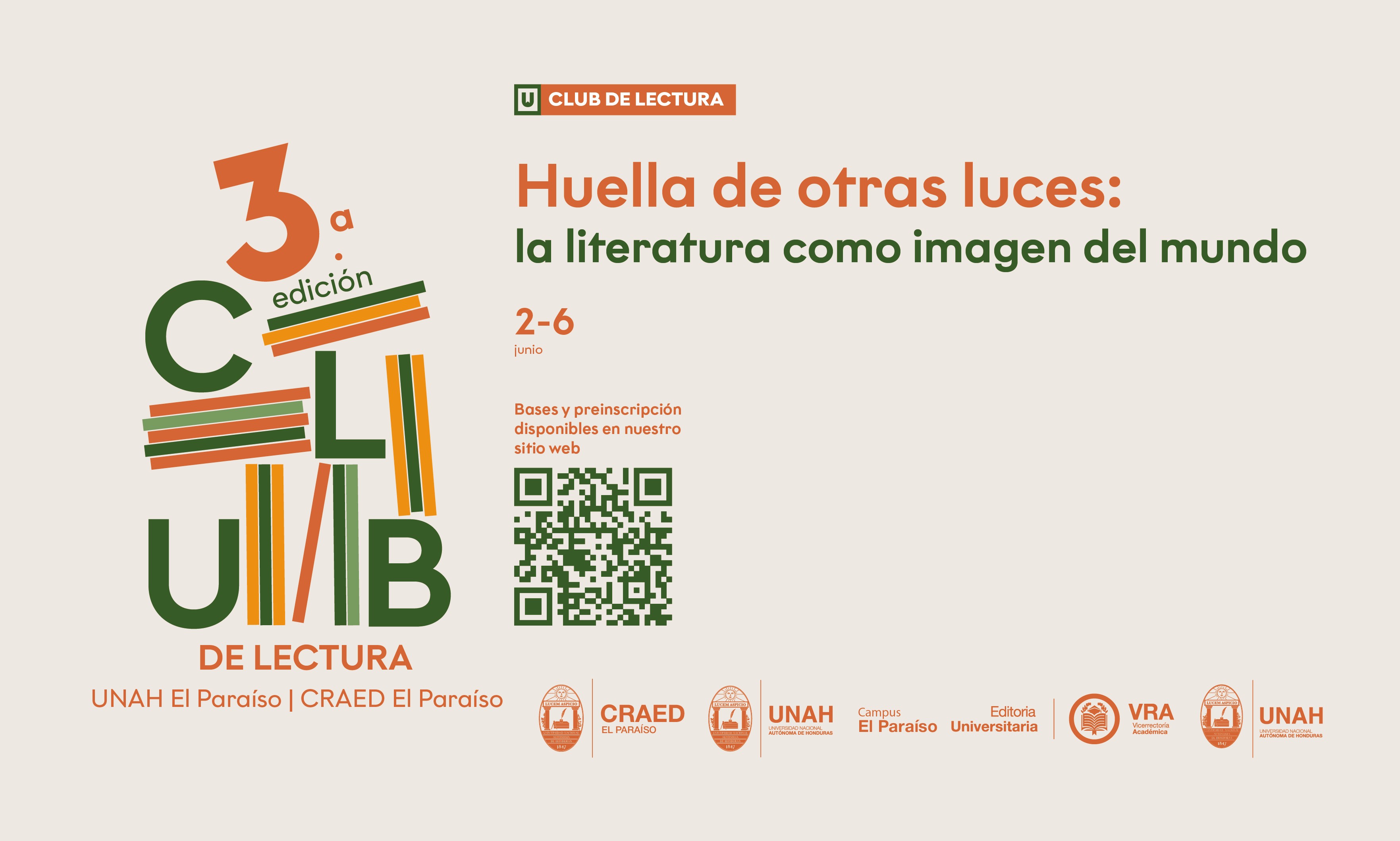 Tegucigalpa, 3 de junio de 2025. La Editorial Universitaria (UNAH) se complace en anunciar la convocatoria para la tercera edición del Club de Lectura UNAH El Paraíso | CRAED El Paraíso. Si sos estudiante, docente o empleado de UNAH Campus El Paraíso, y querés forjar el hábito de la lectura y aprender más sobre el mundo del análisis literario, podes ser parte del Club de UNAH El Paraíso.