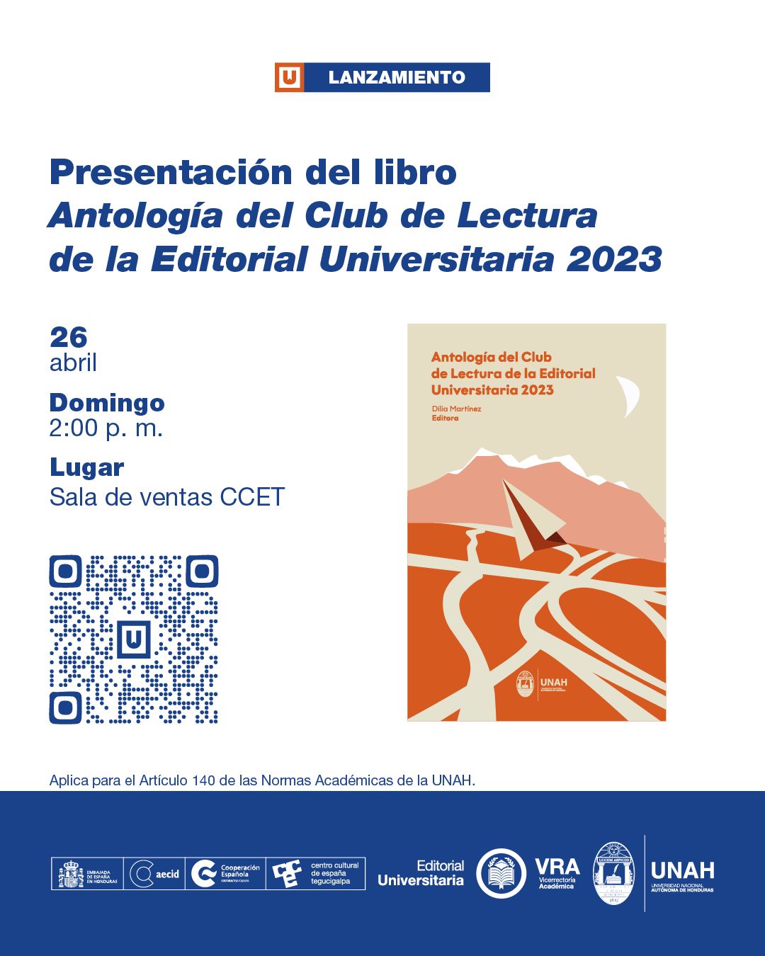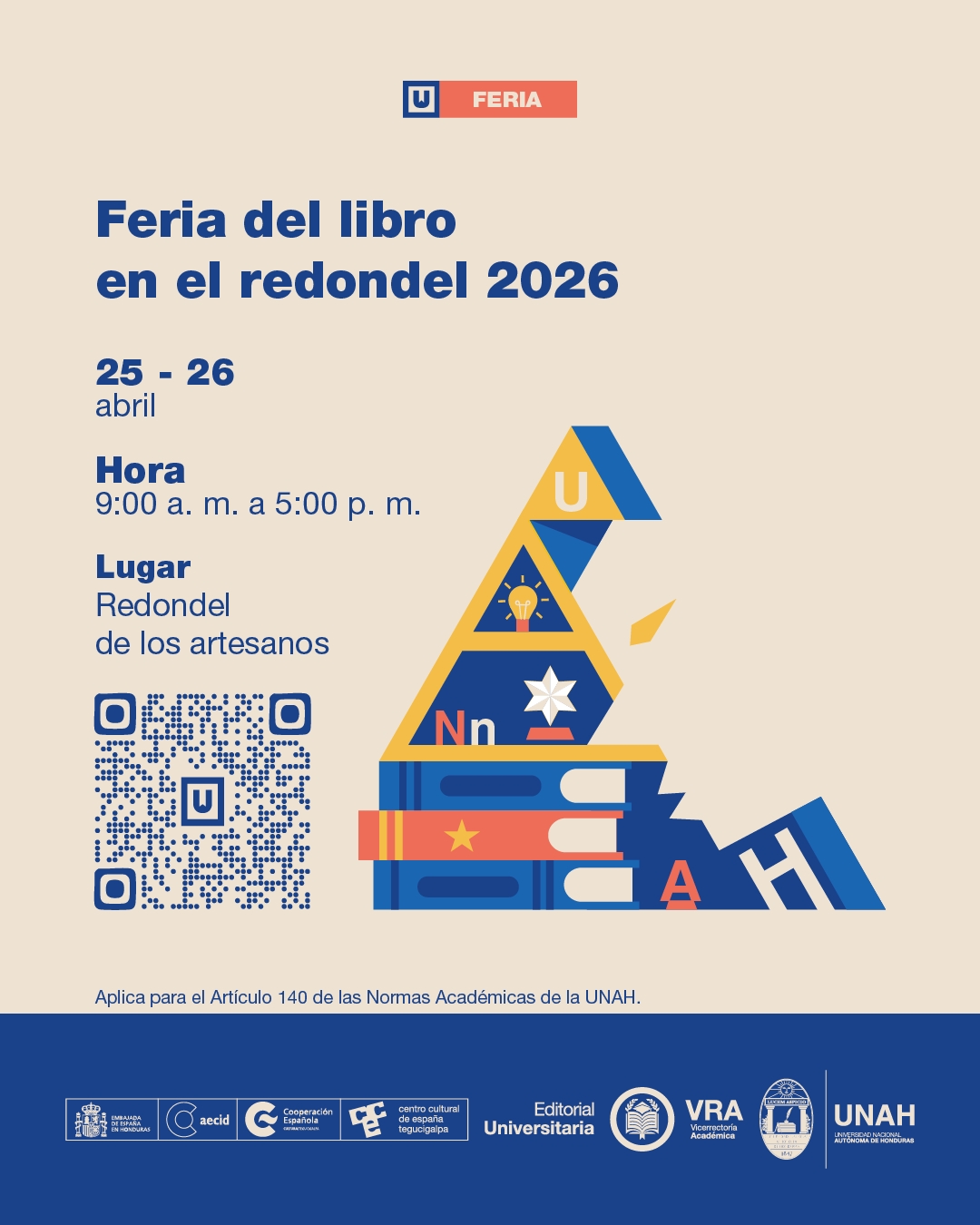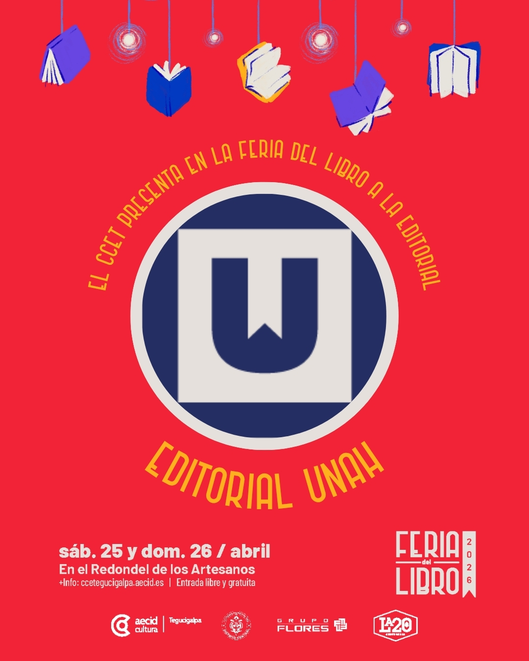 Tegucigalpa, 14 de abril de 2026. Entre libros, lectores y espacios de encuentro cultural, la UNAH dirá presente en la Feria del Libro en el Redondel 2026 del Centro Cultural de España en Tegucigalpa (CCET), en el contexto del Año Académico 2026 Dra. María Elena Bottazzi, por medio de la Vicerrectoría Académica, a través de la Editorial Universitaria.