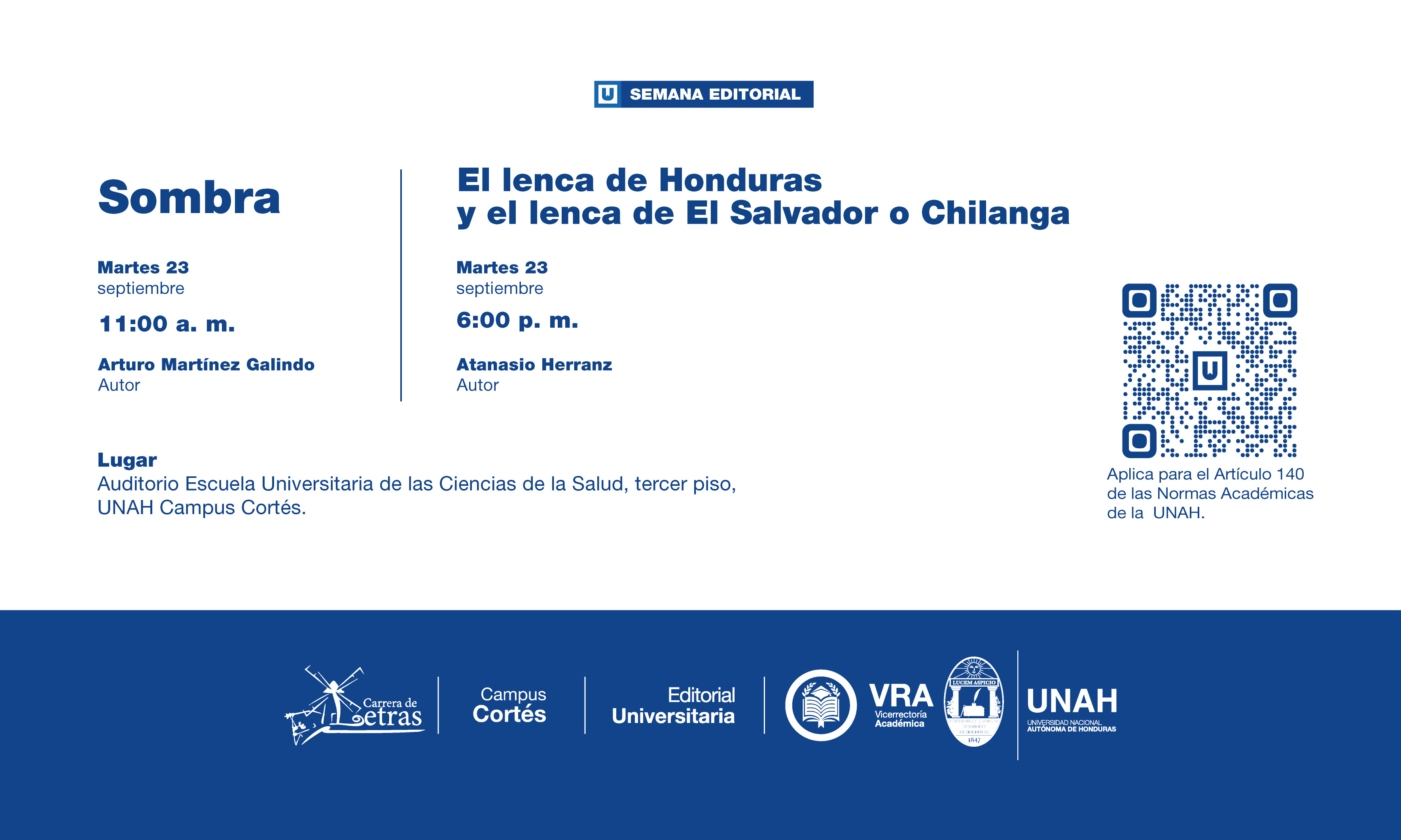 Tegucigalpa, 22 de septiembre de 2025. La Vicerrectoría Académica, a través de la Editorial Universitaria, anuncia su participación en la semana editorial en el marco del Seminario de Estudios Literarios y Lingüísticos a desarrollarse desde el lunes 22 hasta el miércoles 24 de septiembre en UNAH Campus Cortés. Nuestra presencia reafirma el compromiso de la institución como parte de las actividades programadas durante el Año Académico 2025 José Dionisio de Herrera.