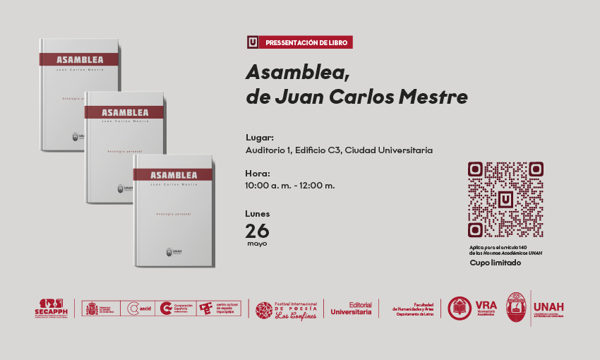 Tegucigalpa, 20 de mayo de 2025. El próximo lunes 26 de mayo, la Vicerrectoría Académica, a través de la Editorial Universitaria y en coordinación con la Facultad de Humanidades y Artes de la UNAH, realizará la presentación del libro Asamblea, obra del reconocido poeta español Juan Carlos Mestre, galardonado con el Premio Nacional de Poesía de España, en el Auditorio 1 del Edificio C3, a las 10:00 a. m.