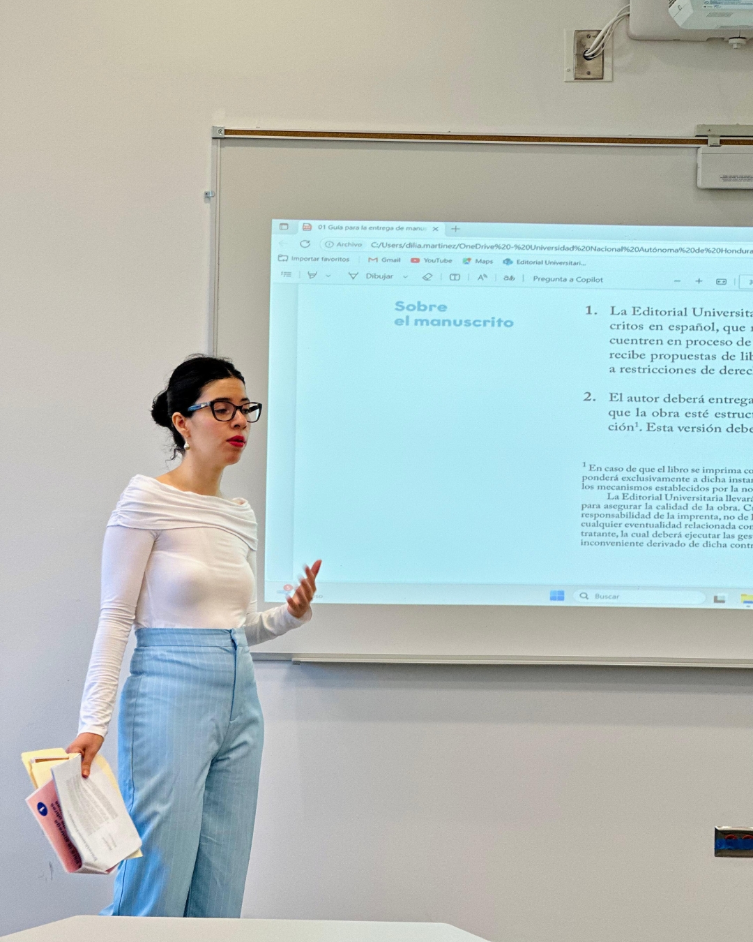 La presentación se desarrolló en el Aula 401, del Edificio 1847, en donde la jefa del Departamento de Edición de la Editorial Universitaria, Dilia Martínez, inició a las 10:00 a. m. con palabras de bienvenida, señalando la importancia de contar con lineamientos claros y actualizados para la presentación de manuscritos.