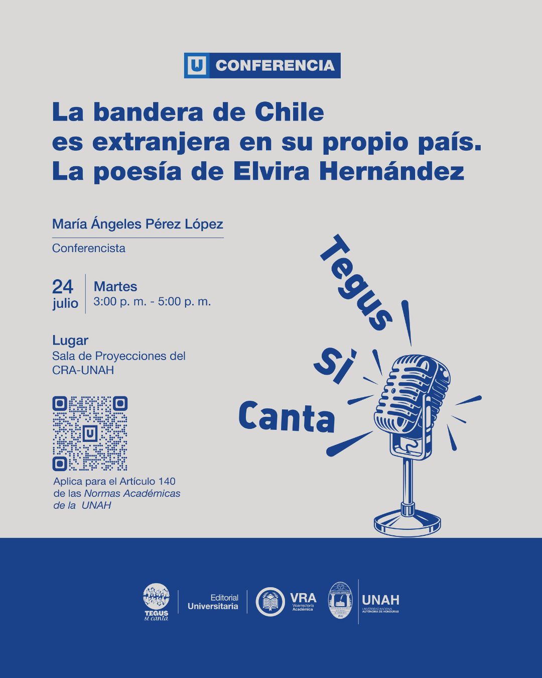 Como parte de esta agenda, el martes 24 de julio se desarrollará la conferencia La bandera de Chile es extranjera en su propio país. La poesía de Elvira Hernández, a cargo de la reconocida poeta y académica española María Ángeles Pérez López. El evento se realizará de 3:00 p. m. a 5:00 p. m. en la misma sala, brindando un espacio de análisis sobre la poesía crítica, política y feminista de la autora chilena Elvira Hernández, figura esencial de la resistencia literaria en América Latina.
