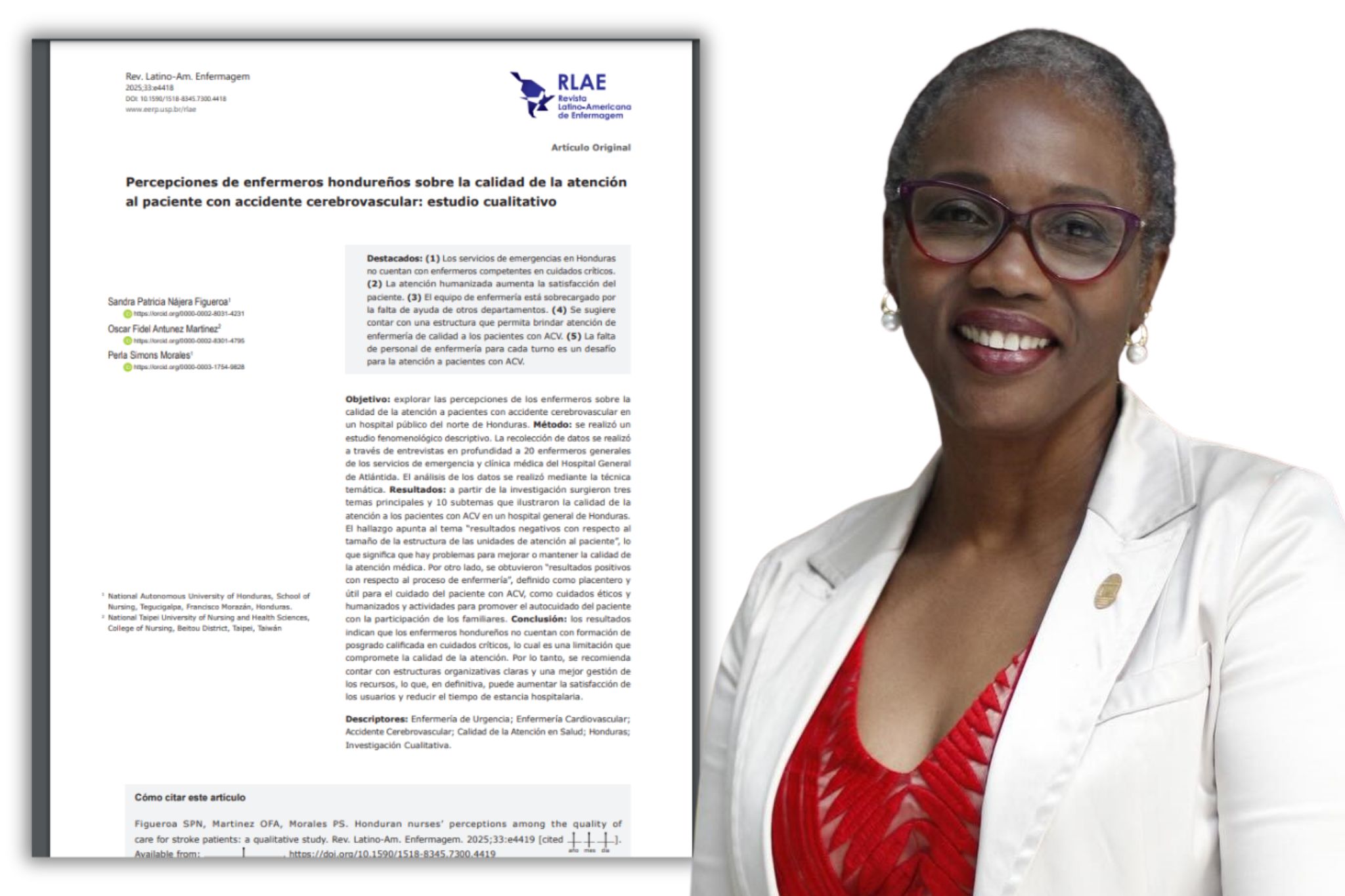 La Decana de la Facultad de Ciencias Médicas de la Universidad Nacional Autónoma de Honduras (UNAH), Msc. Perla Simons Morales, es coautora de un estudio que analiza las percepciones de los enfermeros sobre la calidad del cuidado a pacientes con accidentes cerebrovasculares en Honduras.