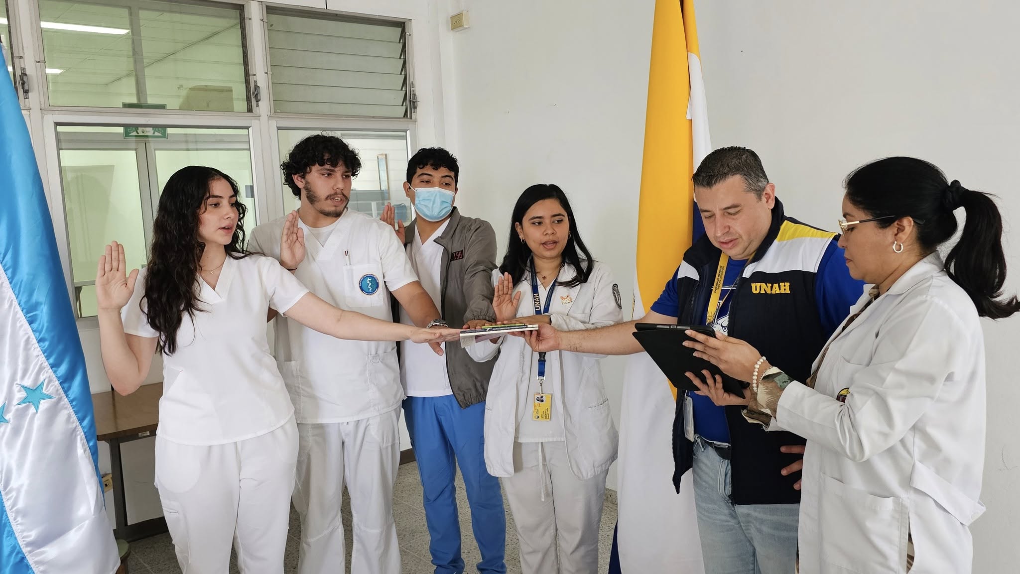 Este martes fueron juramentados cuatro estudiantes que se integran como nuevos representantes ante la Junta Directiva de la Facultad de Ciencias Médicas de la UNAH. El acto se llevó a cabo en presencia de autoridades universitarias y miembros del órgano directivo.