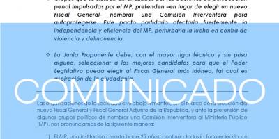 Las organizaciones de la sociedad civil abajo firmantes, en el marco de la elección del nuevo Fiscal General y Fiscal General Adjunto de la República, y ante la pretensión de algunos grupos políticos de nombrar una Comisión Interventora al Ministerio Público (MP), nos pronunciamos de la siguiente manera: