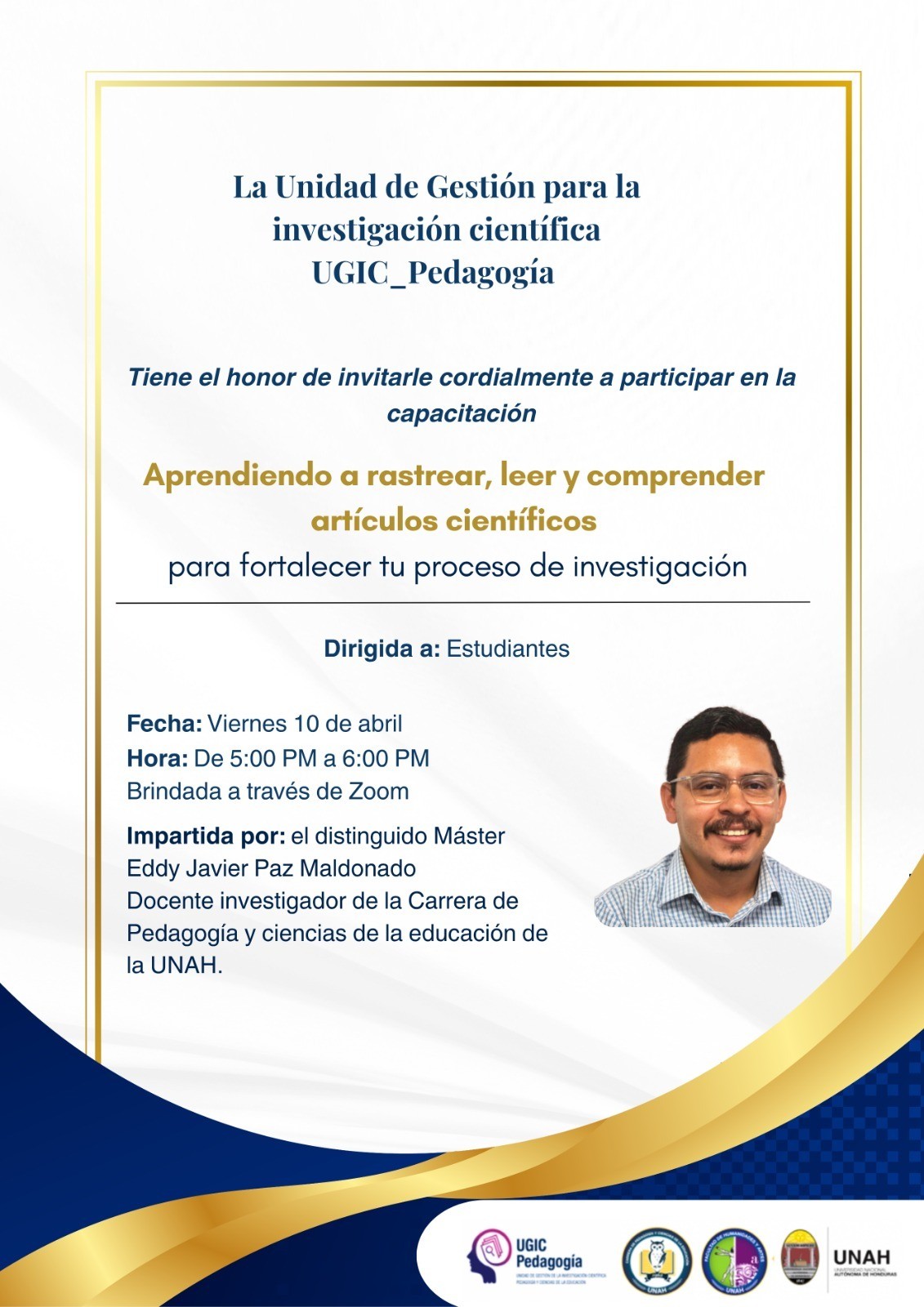La capacitación será impartida por el máster Eddy Javier Paz Maldonado, profesional con amplia experiencia en investigación educativa, quien compartirá estrategias prácticas para optimizar el uso de fuentes científicas y mejorar los procesos de investigación académica.