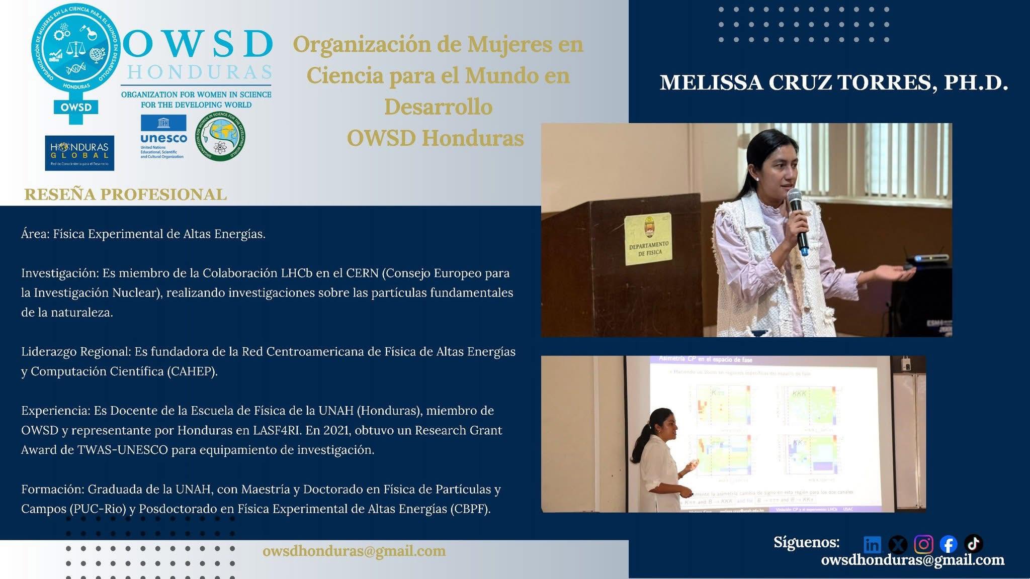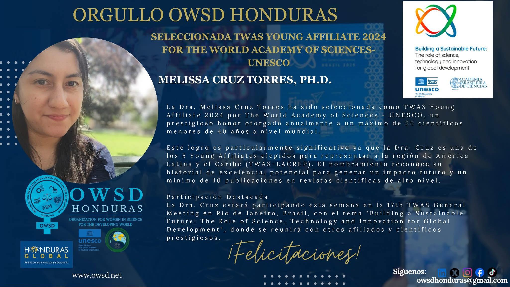 17th TWAS General Meeting, realizada en Río de Janeiro bajo el lema “Building a Sustainable Future: The Role of Science, Technology and Innovation for Global Development”. Cada año, TWAS-UNESCO elige únicamente a 25 científicos menores de 40 años por su excelencia académica, liderazgo y contribución al desarrollo sostenible mediante la ciencia. De ese grupo, solo cinco pertenecen a América Latina y el Caribe, entre ellos la Dra. Cruz, destacando a Honduras en el ámbito de la investigación científica global.