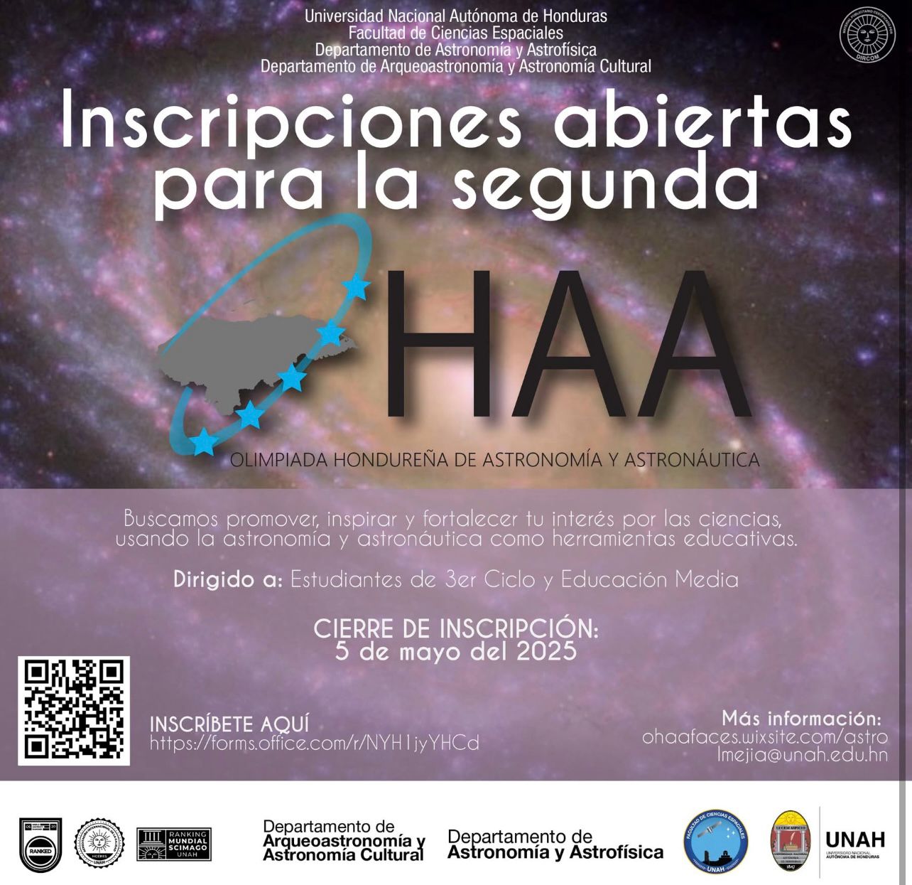 Las inscripciones estarán abiertas hasta el 5 de mayo de 2025, para que los estudiantes interesados puedan anotarse en la página https://forms.office.com/r/NYH1jyYHCd o realizar sus consultas en la página principal de la Facultad de Ciencias Espaciales UNAH.