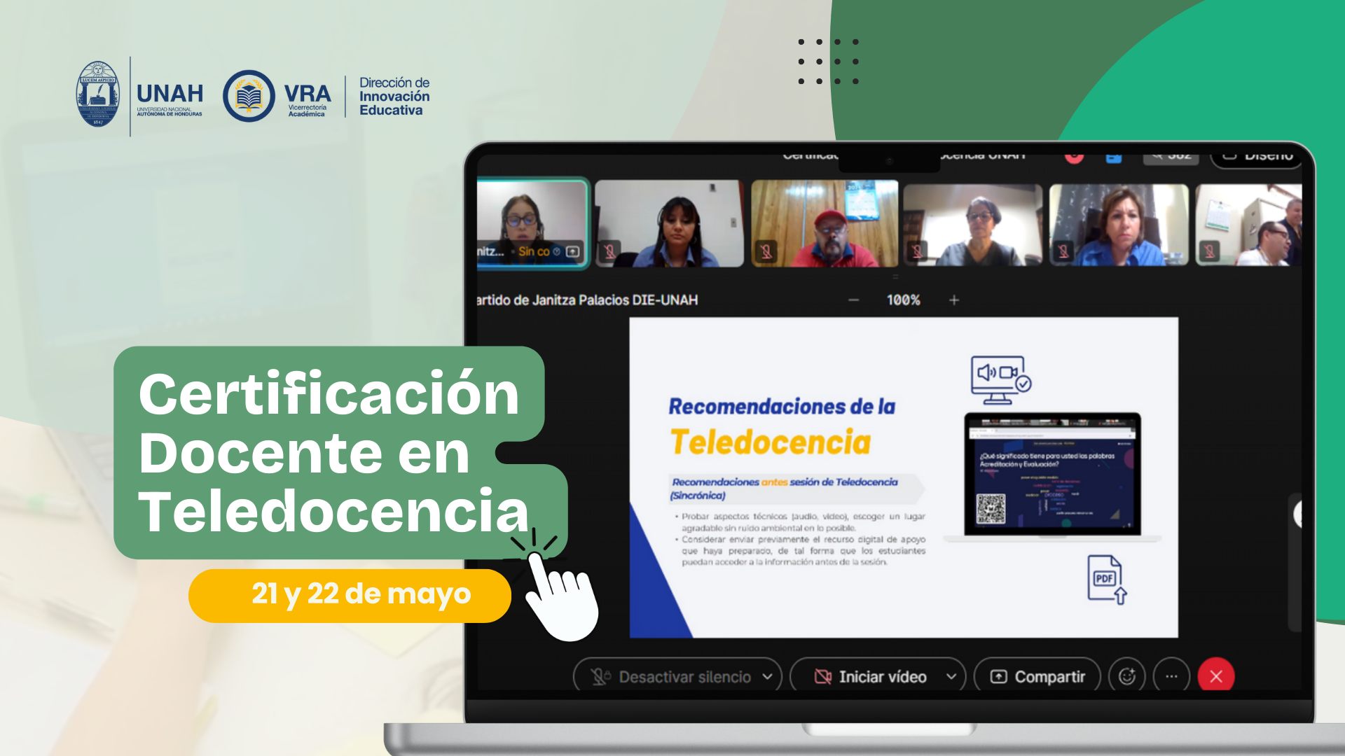 La Dirección de Innovación Educativa (DIE), de la Universidad Nacional Autónoma de Honduras (UNAH), durante dos días brindó capacitaciones en las jornadas matutina y vespertina para compartir con los docentes de la modalidad de teledocencia lineamientos pedagógicos y técnicos para el desarrollo de sus sesiones sincrónicas.