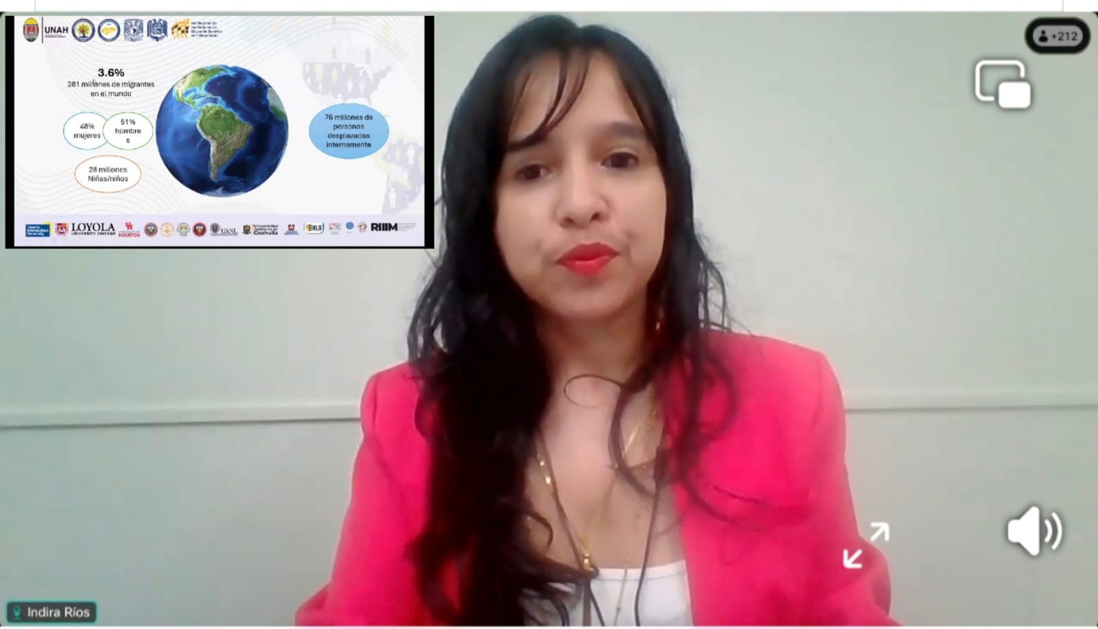 Bajo el tema “Elementos para el análisis de la movilidad humana: una mirada global, regional y nacional”, la experta expuso algunas teorías migratorias, brindó datos globales de la migración, datos de América y particularizó datos de Honduras.