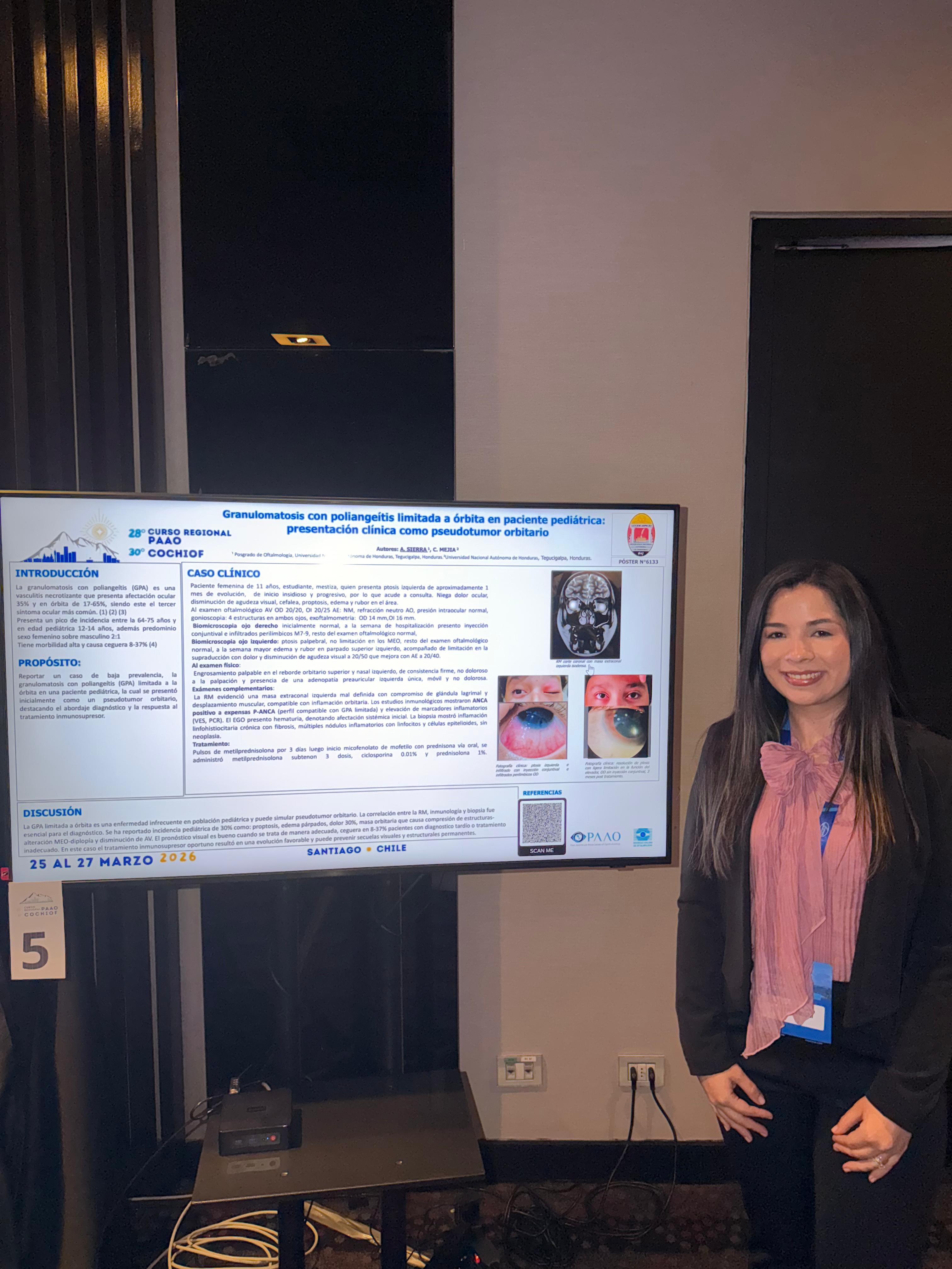 Respecto a los estudios de casos clínicos, en el caso de la residente Sierra dimensionaba un reto al ser inusual al ser pediátrico por su baja incidencia. “El paciente tuvo un diagnóstico y manejo oportuno lo que permitió evitar complicaciones y secuelas visuales importantes. Uno de los principales retos fue sintetizar un caso clínico poco frecuente y complejo sin perder relevancia clínica. También representó un desafío integrar y presentar de forma clara los hallazgos clínicos, imagenológicos y de laboratorio, así como organizar el contenido resaltando el diagnóstico diferencial con otras patologías orbitarias”.