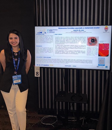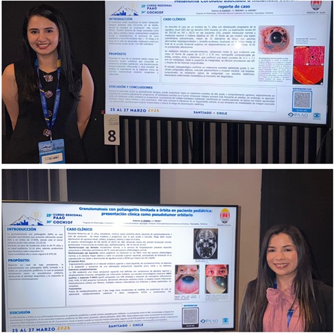 La participación de ambas incluyó la presentación de dos casos clínicos: “Granulomatosis con poliangeitis limitada a órbita en una paciente pediátrica” y “Melanoma Coroideo asociado a melanosis ocular”, respectivamente durante el evento.