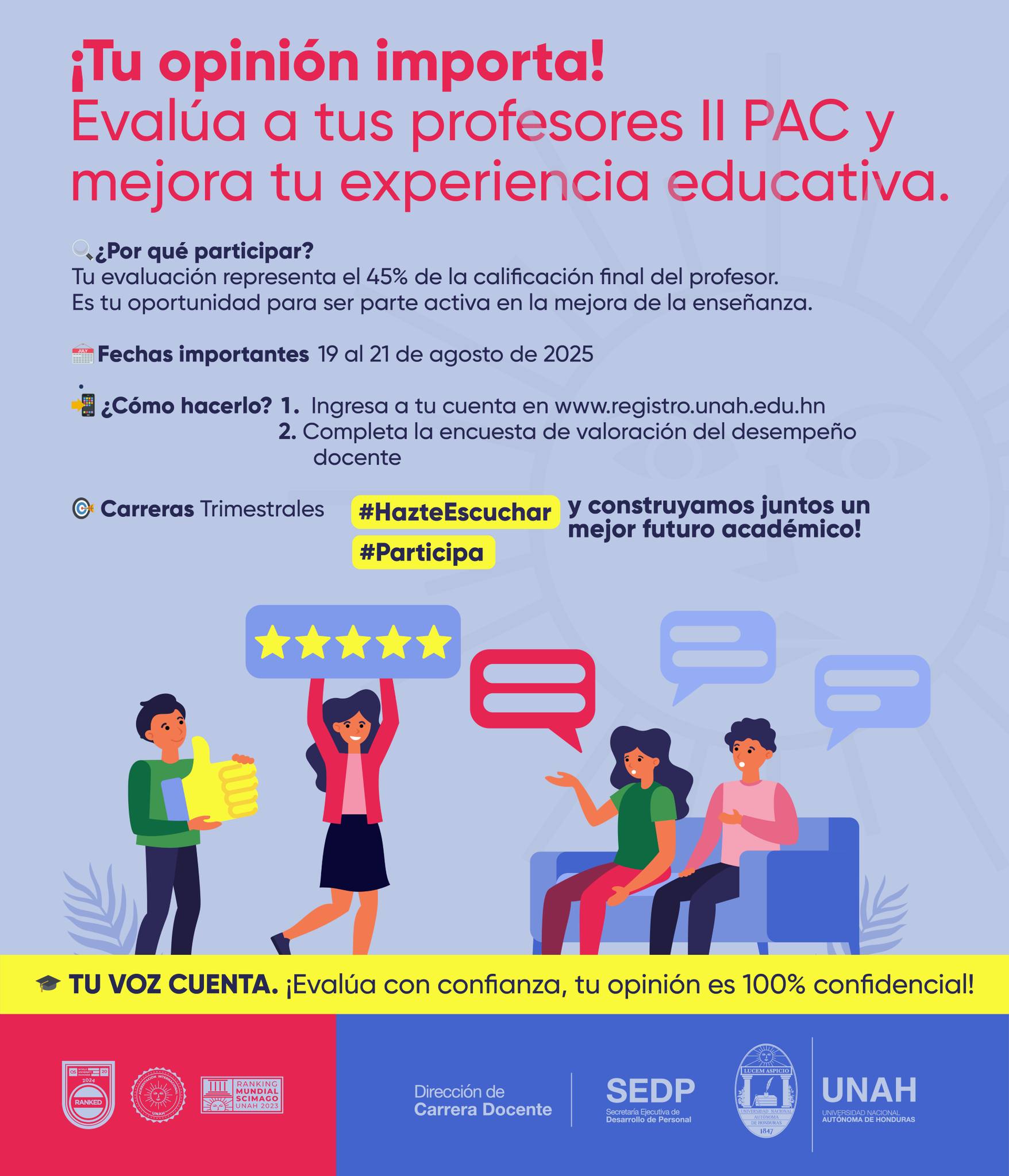 La Universidad Nacional Autónoma de Honduras (UNAH) invita a toda la comunidad estudiantil a ser parte del proceso de evaluación docente correspondiente al Segundo Período Académico (II Pac 2025), como una oportunidad clave para la mejora de la experiencia educativa en la Máxima Casa de Estudios.