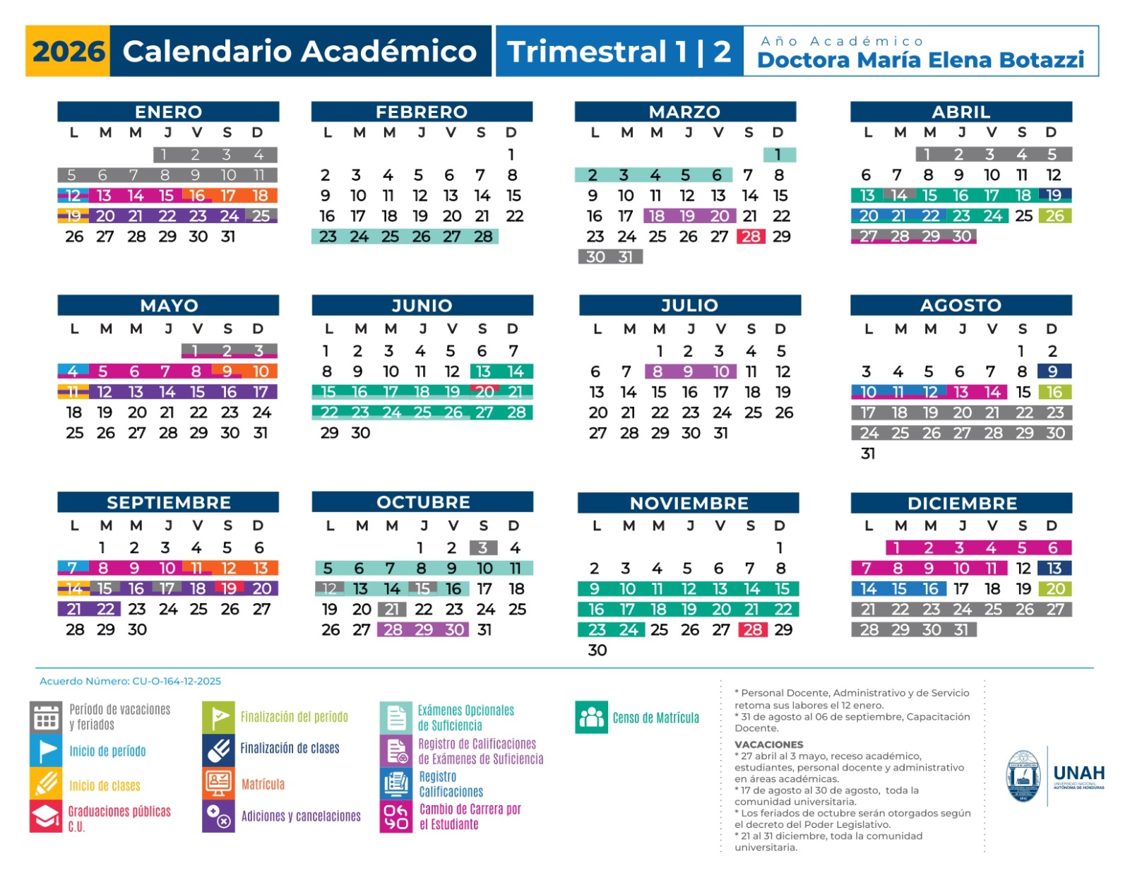 La Universidad Nacional Autónoma de Honduras (UNAH) dio a conocer oficialmente su Calendario Académico 2026, correspondiente al sistema trimestral, en el que se establecen las fechas más relevantes para el desarrollo de las actividades académicas y administrativas del próximo año. El documento está dirigido a estudiantes de grado y posgrado, personal docente y aspirantes que desean ingresar a la institución.
