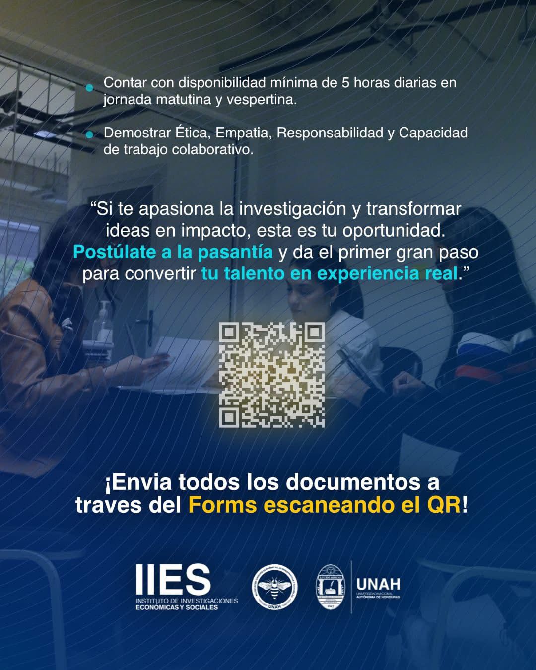 Esta convocatoria se lleva a cabo a través del Programa de Investigaciones en Organización y Dirección De Empresas (PIODE) del IIES, con el fin que estudiantes de la UNAH y otras instituciones de educación superior puedan obtener una experiencia real de aprendizaje y formación en dirección de empresas e investigación, además de la apertura a diversas actividades profesionales a realizar durante su estadía laboral.