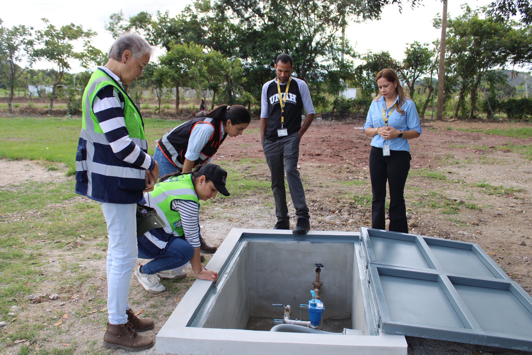 Participaron en la jornada la ingeniera Virginia Margarita Valle, directora de Control y Seguimiento de Proyectos; la ingeniera Delia Valladares, directora de Proyectos en Centros Regionales; el ingeniero German Barahona, especialista en sistemas eléctricos y telecomunicaciones y supervisor de la parte eléctrica del pozo; y la ingeniera Paola Flores, supervisora general del proyecto. Por parte del campus, acompañaron el recorrido de revisión el máster Jaime Valerio, director del Campus El Paraíso, y la ingeniera Mery Castellanos, jefa regional de Servicios Generales.