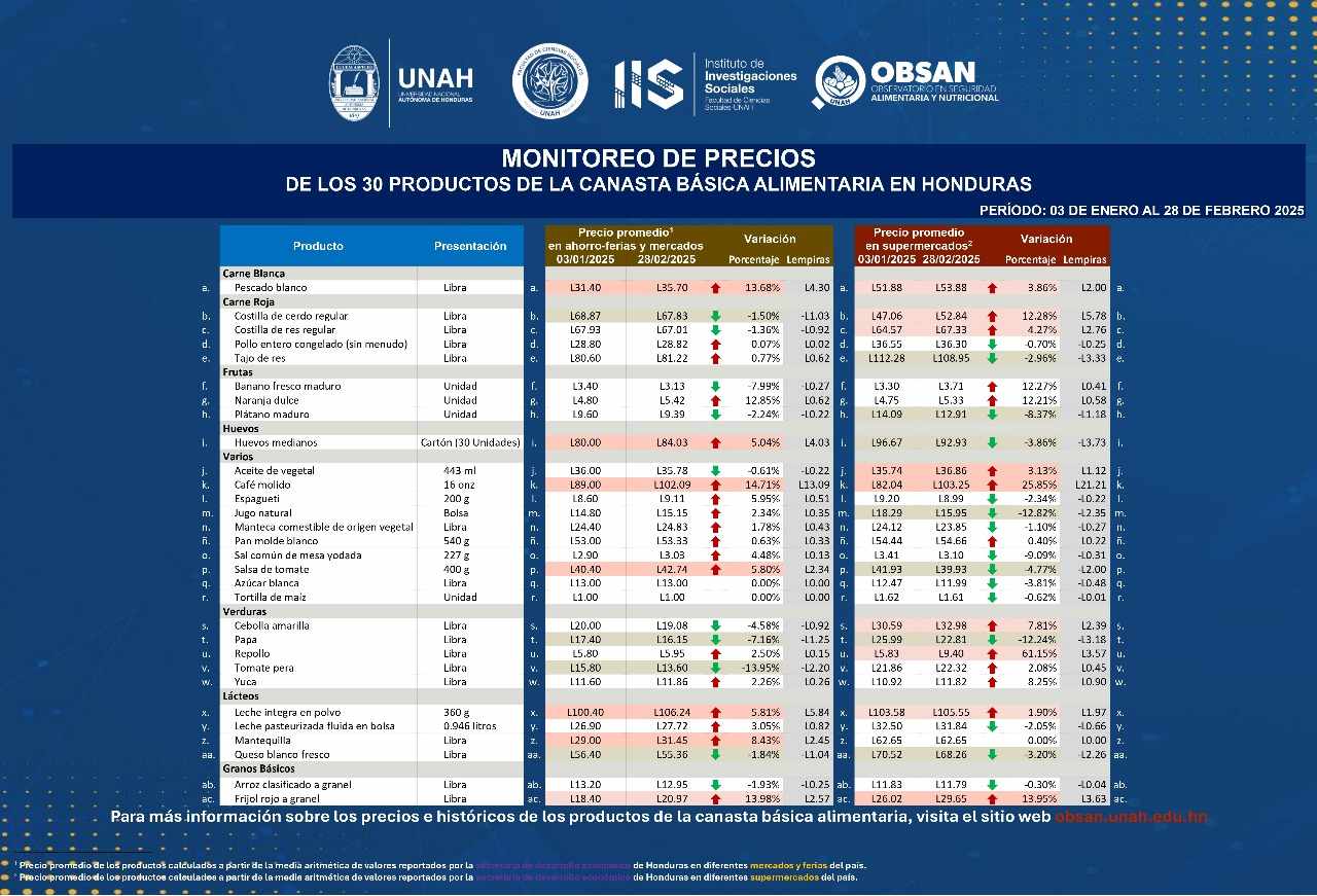 Este análisis refleja el comportamiento de precios en los distintos establecimientos y espacios en los que se distribuyen los 30 productos que se incluyen en la canasta básica en las ciudades de Tegucigalpa y San Pedro Sula, durante el período del 3 de enero al 28 de febrero de 2025.