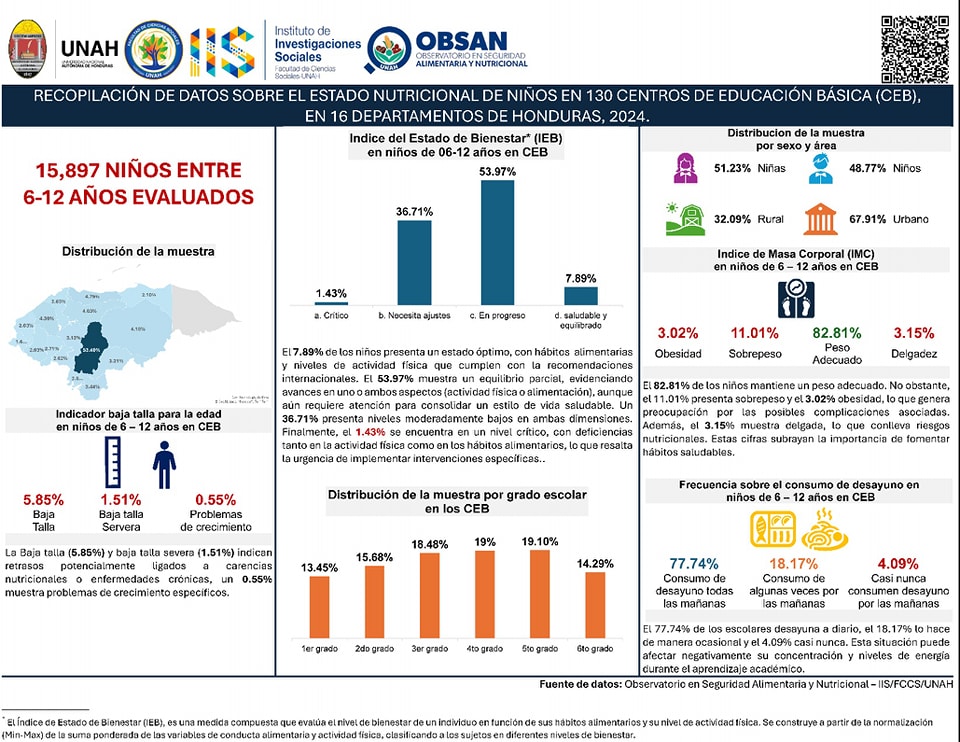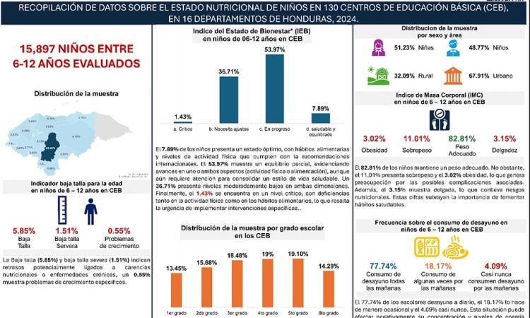 La Facultad de Ciencias Sociales a través del El Observatorio en Seguridad Alimentaria del Instituto de Investigaciones Sociales presenta datos sobre el estado nutricional de 15,897 niños entre 6 y 12 años en 130 Centros de Educación Básica de Honduras. Los resultados muestran que el 82.81% mantiene un peso adecuado, mientras que el 11.01% presenta sobrepeso y el 3.02% obesidad, lo que genera preocupación por su impacto en la salud.