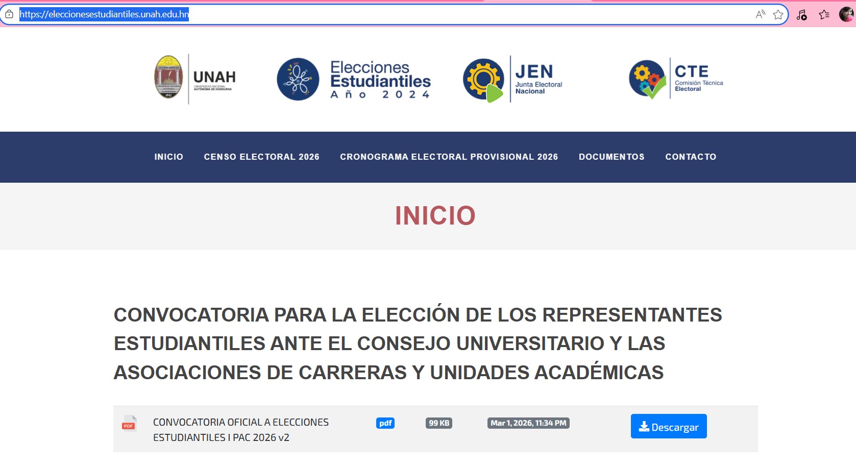 La Junta Electoral Nacional (JEN) lanzó de manera oficial la convocatoria para que el próximo 8 de abril de 2026 se efectúen de manera virtual las Elecciones Estudiantiles en la Universidad Nacional Autónoma de Honduras (UNAH).