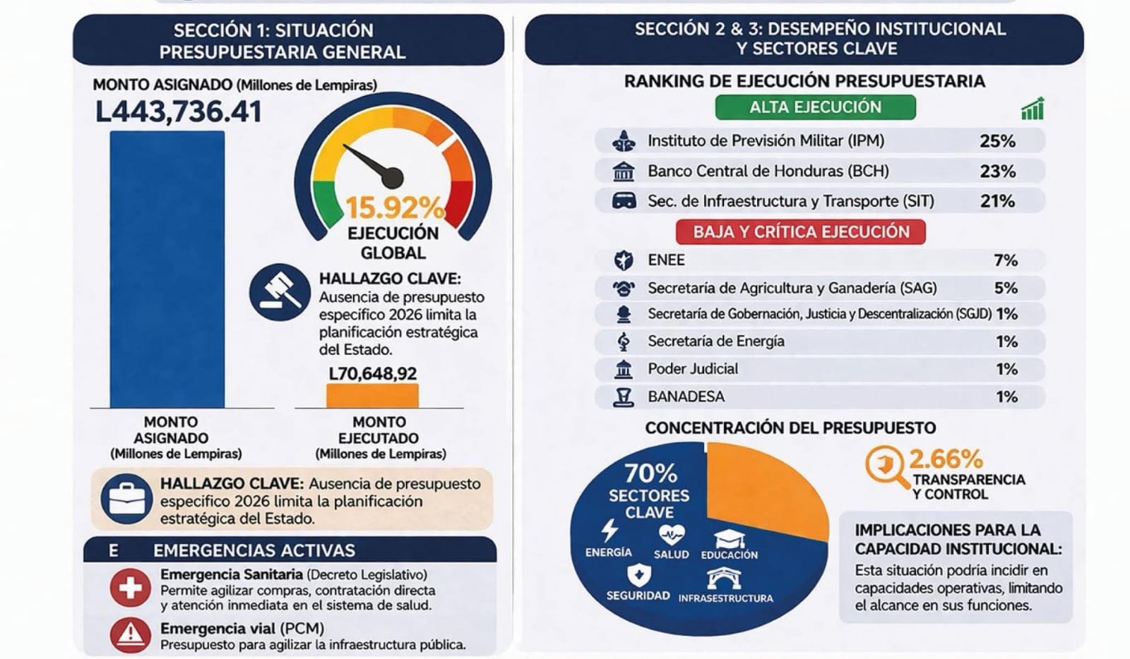 De un monto asignado de 443,736.41 millones, solo se han ejecutado L70,648.92 millones, es decir, el 15.92%. El informe segmenta este desempeño en dos extremos; por un lado la alta ejecución liderada por el Instituto de Previsión Militar (IPM) con un 25%, el Banco Central (BCH) con 23% y la Secretaría de Infraestructura (SIT) con 21%, mientras que la baja y crítica ejecución corresponde a sectores como la Empresa Nacional de Energía Eléctrica (7%) y la Secretaría de Agricultura (5%) y aún más alarmante es la ejecución de apenas el 1% en la Secretaría de Energía, el Poder Judicial y Banadesa.