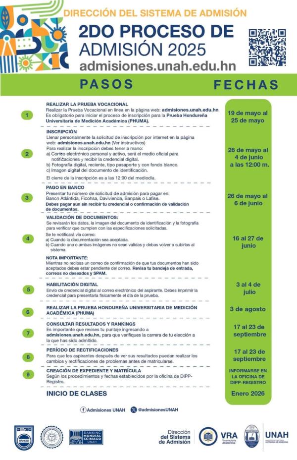 La Universidad Nacional Autónoma de Honduras (UNAH) publicó el calendario oficial para el segundo proceso de admisión de este año. Los aspirantes deberán cumplir una serie de pasos claves con fechas específicas para asegurar su ingreso a la institución en el 2026.
