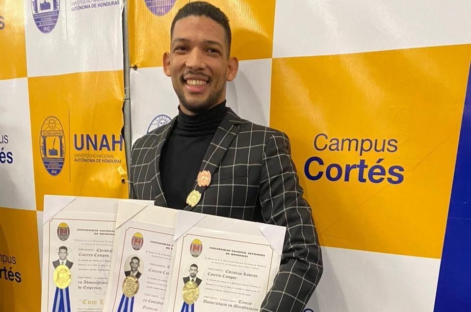 Este es el caso de Christian Roberto Cáceres Campos, originario de El Progreso, Yoro, quien en las recientes graduaciones de UNAH Campus Cortés, a sus 31 años de edad obtuvo su tercer título universitario.