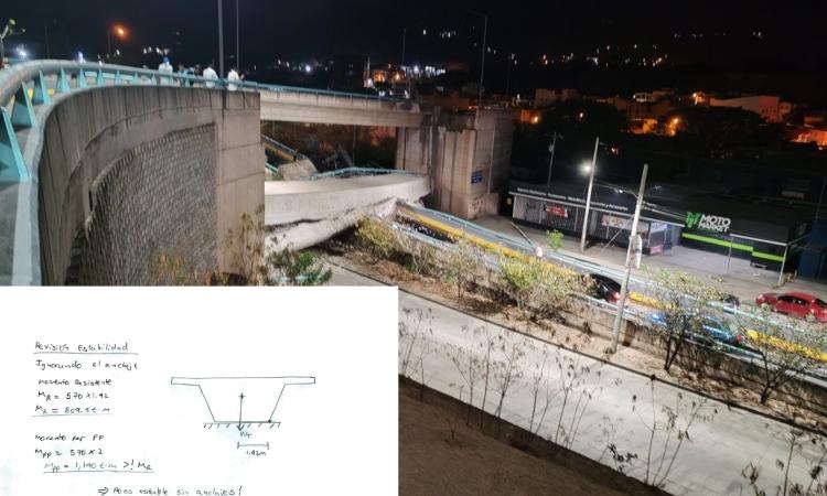 Se trata de los ingenieros Fabricio Ortiz y David Gutiérrez, con el apoyo de Nelson Serpas, quienes, tras cálculos preliminares y análisis del comportamiento de la estructura mediante modelos físicos, atribuyen la caída de dicha vía, que conecta la capital con los municipios de Santa Lucía y Valle de Ángeles, a la pérdida de estabilidad de la estructura debido a su geometría curva y el daño de sus barras de anclaje en el apoyo, posiblemente causado por el efecto combinado de corrosión y fatiga.
