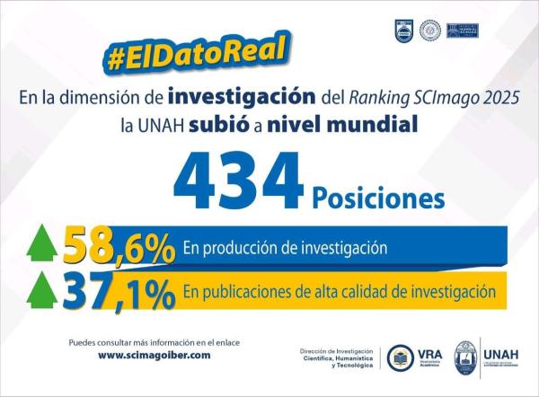 En edición 2025 del Ranking SCimago, en la dimensión de investigación, la Universidad Nacional Autónoma de Honduras (UNAH) subió 434 posiciones a nivel mundial tras mejorar 9 de los 12 indicadores.