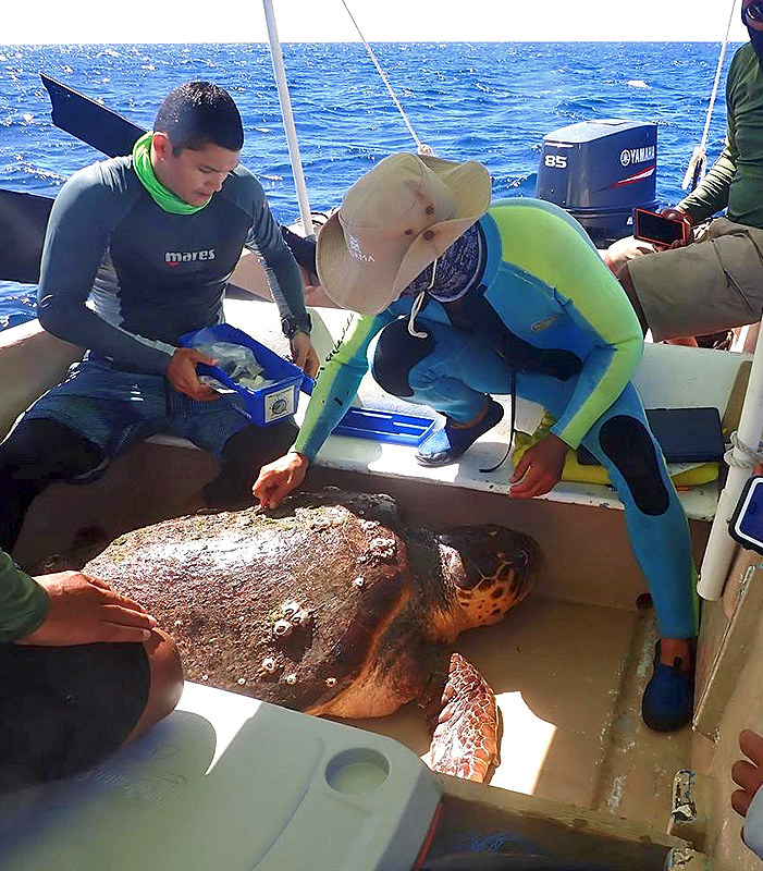 Medir el tamaño de las tortugas marinas permite a los científicos rastrear el crecimiento y la salud de las mismas.
