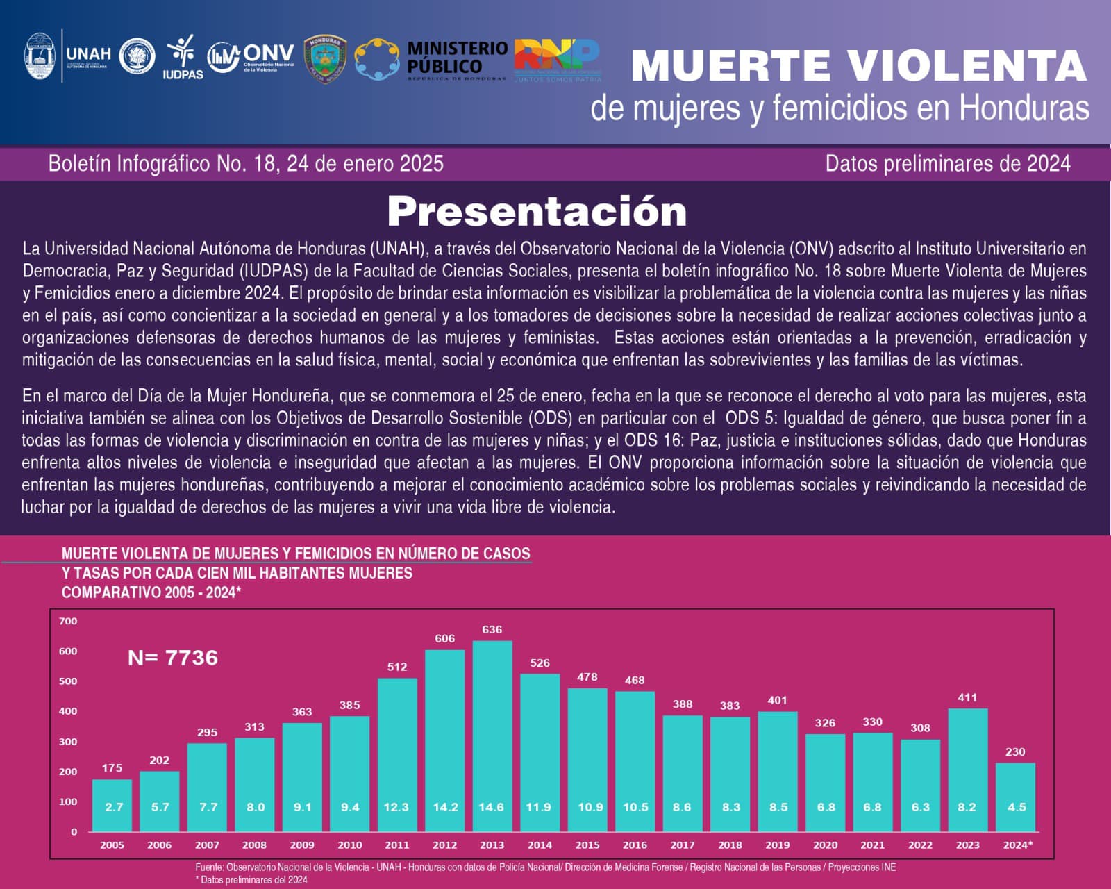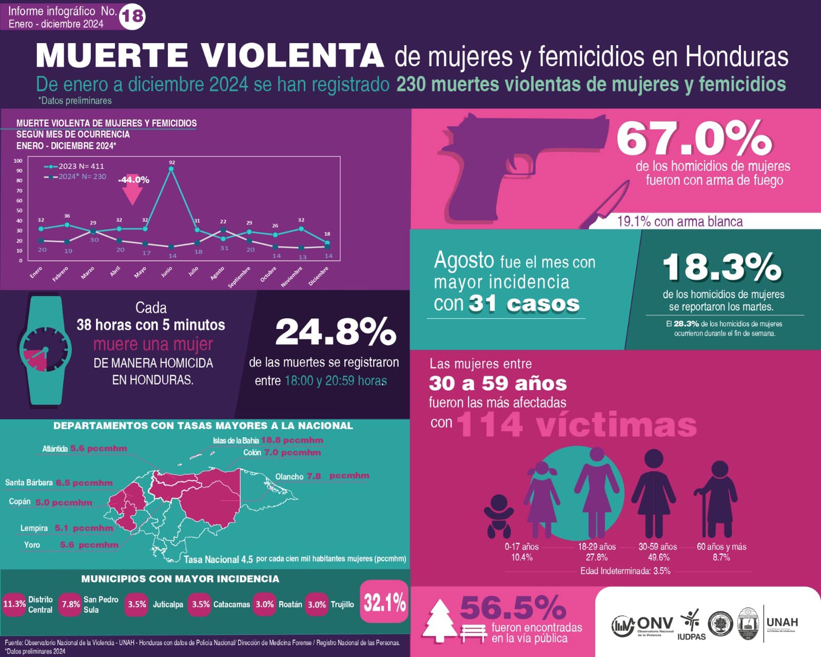 Conforme al Boletín infográfico número 18 sobre Muerte Violenta de Mujeres y Femicidios publicado esta semana por el Observatorio Nacional de la violencia (ONV-UNAH), entre enero y diciembre de 2024 perdieron la vida de forma violenta 230 hondureñas, una cada 38 horas con cinco minutos, y en lo que va de este año ya se reportan 18 víctimas.