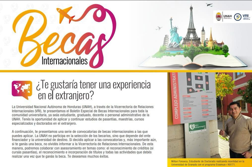 ¿Sueñas con estudiar en el extranjero? Si es así, esta es tu oportunidad de explorar las distintas opciones de becas en el extranjero que encuentras en la segunda publicación del Boletín de Becas Internacionales que cada trimestre actualiza la Vicerrectoría de Relaciones Internacionales (VRI) de la Universidad Nacional Autónoma de Honduras (UNAH).