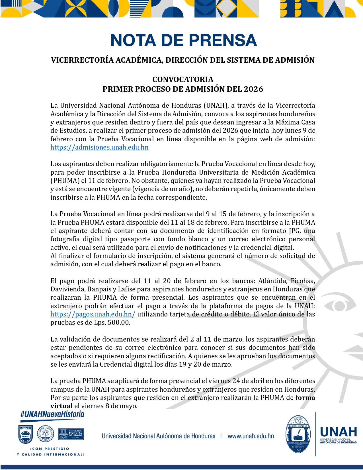 La Universidad Nacional Autónoma de Honduras (UNAH), a través de la Vicerrectoría Académica y la Dirección del Sistema de Admisión, convoca a los aspirantes hondureños y extranjeros que residen dentro y fuera del país que desean ingresar a la Máxima Casa de Estudios, a realizar el primer proceso de admisión del 2026 que inicia hoy lunes 9 de febrero con la Prueba Vocacional en línea disponible en la página web de admisión: https://admisiones.unah.edu.hn