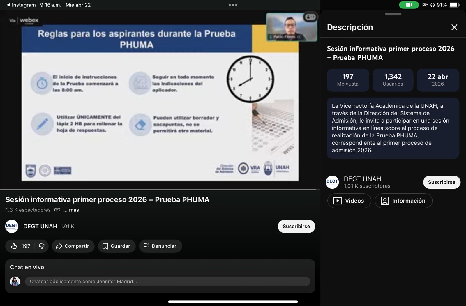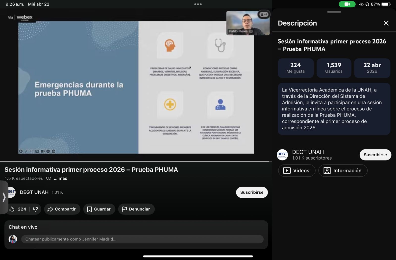 La Universidad Nacional Autónoma de Honduras a través de la Vicerrectoría Académica y la Dirección del Sistema de Admisión, realizó ayer una reunión informativa virtual con los aspirantes habilitados para realizar la Prueba Hondureña Universitaria de Medición Académica (PHUMA) que se llevará a cabo el viernes 24 de abril a nivel nacional.